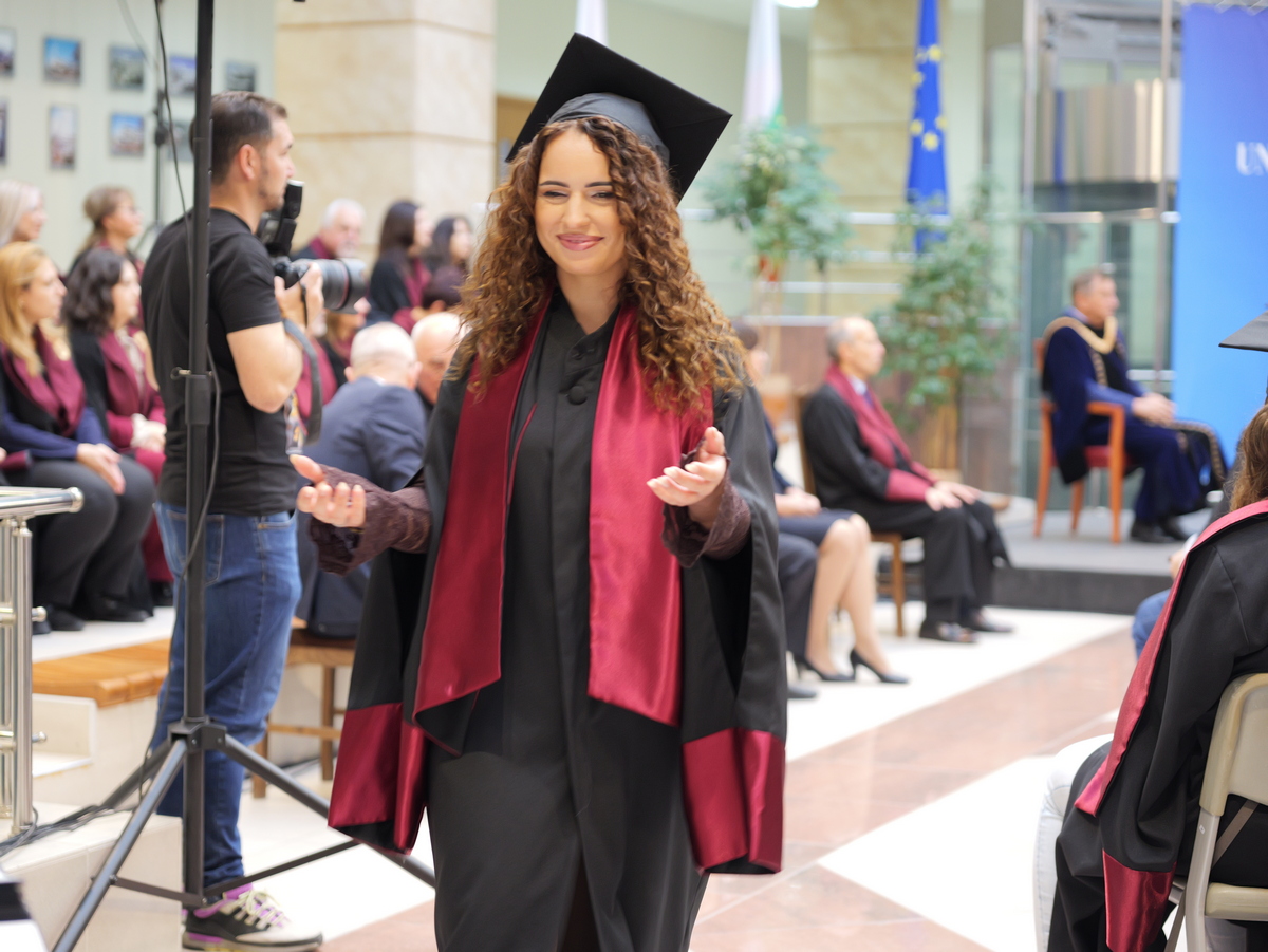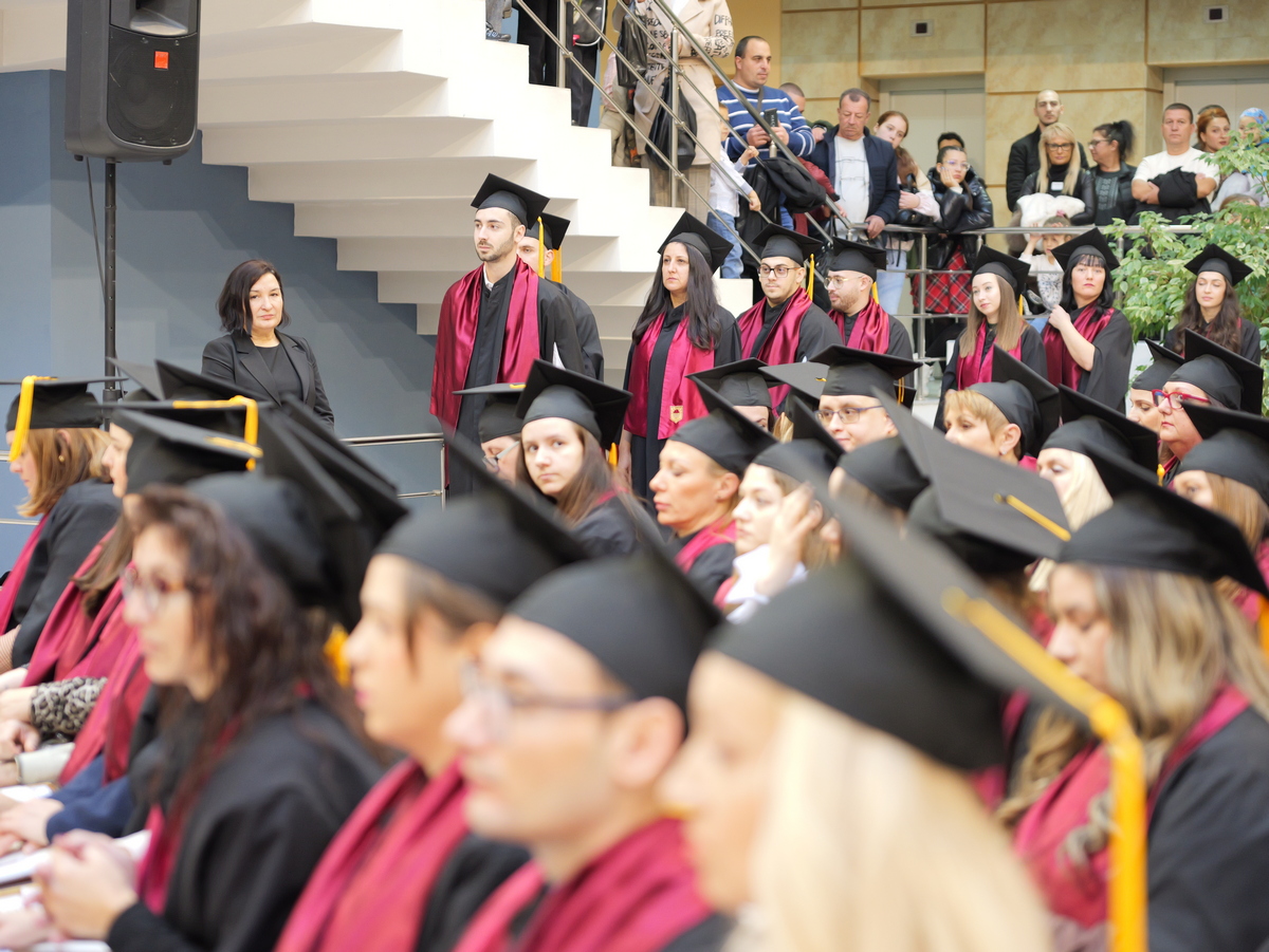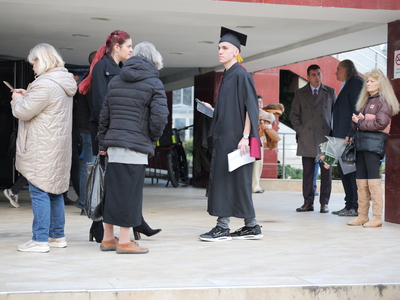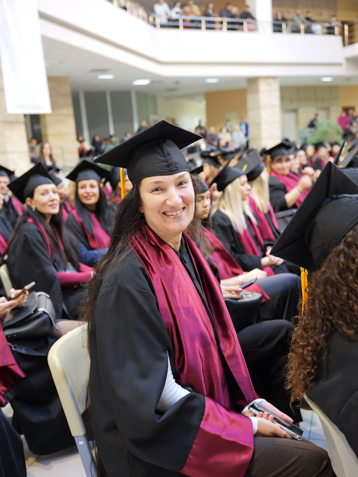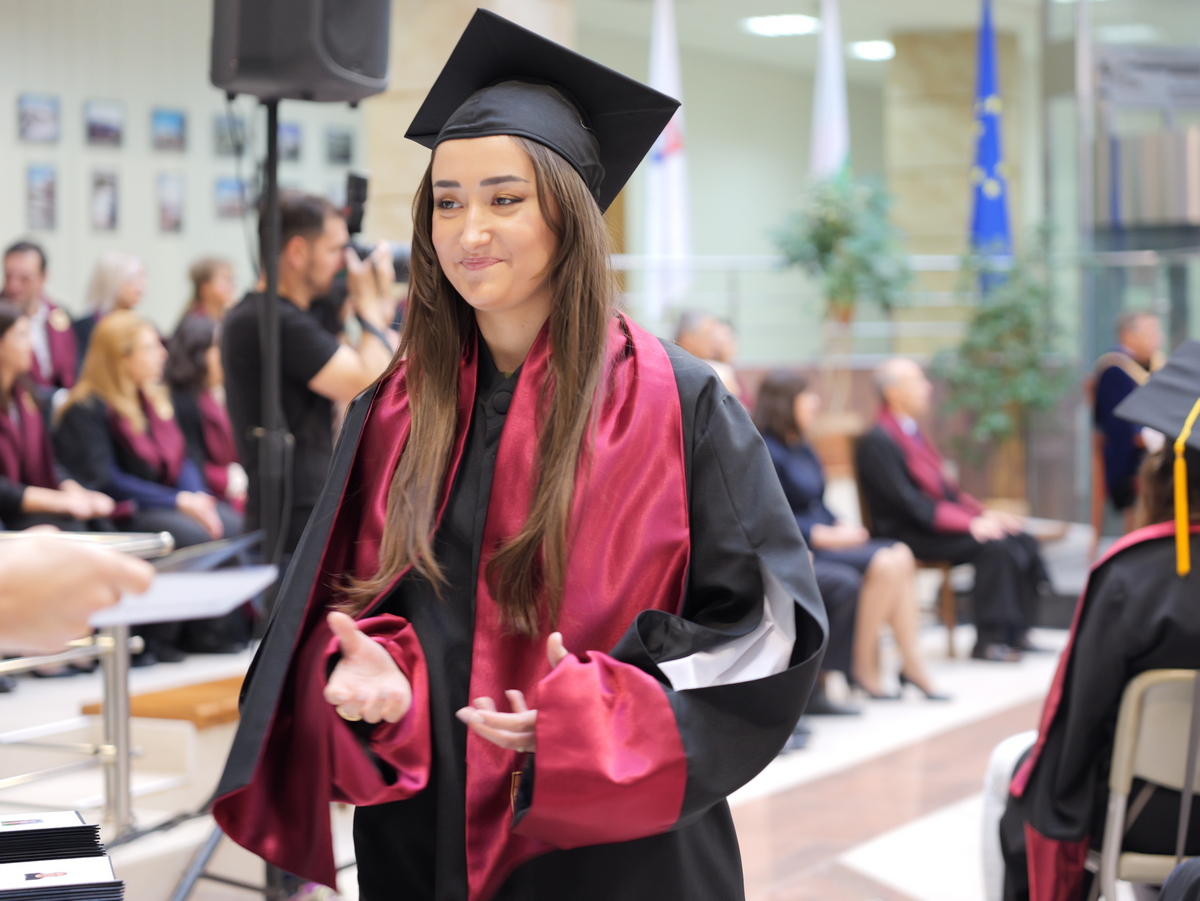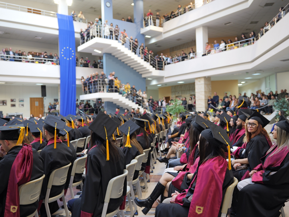От името на абсолвентите приветствие поднесе Аля Казанджиева, магистър от специалност „Иновации и предприемачество в началното и предучилищното образование“ „Всеки от нас влиза в университета изпълнен с мечти и амбиции. Днес си тръгваме като личности, развили се чрез усилия, дисциплина, вдъхновение и непрекъснато учене. Пътят беше предизвикателен, но именно тези предизвикателства ни изградиха, както и подкрепата, насоките и отдадеността на нашите преподаватели, които стояха до нас през всяка стъпка от този път“ – каза в приветствието си Аля Казанджиева.