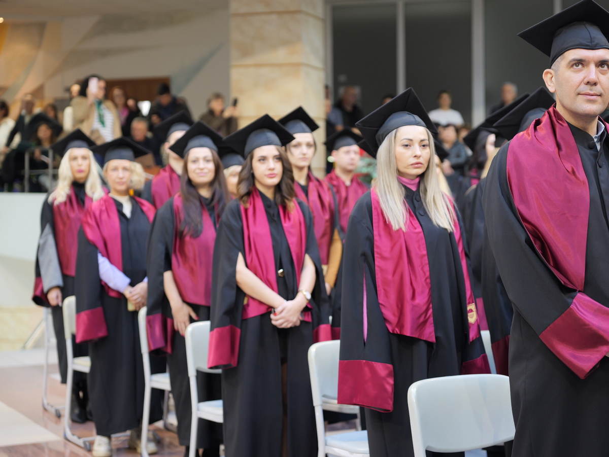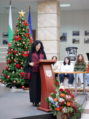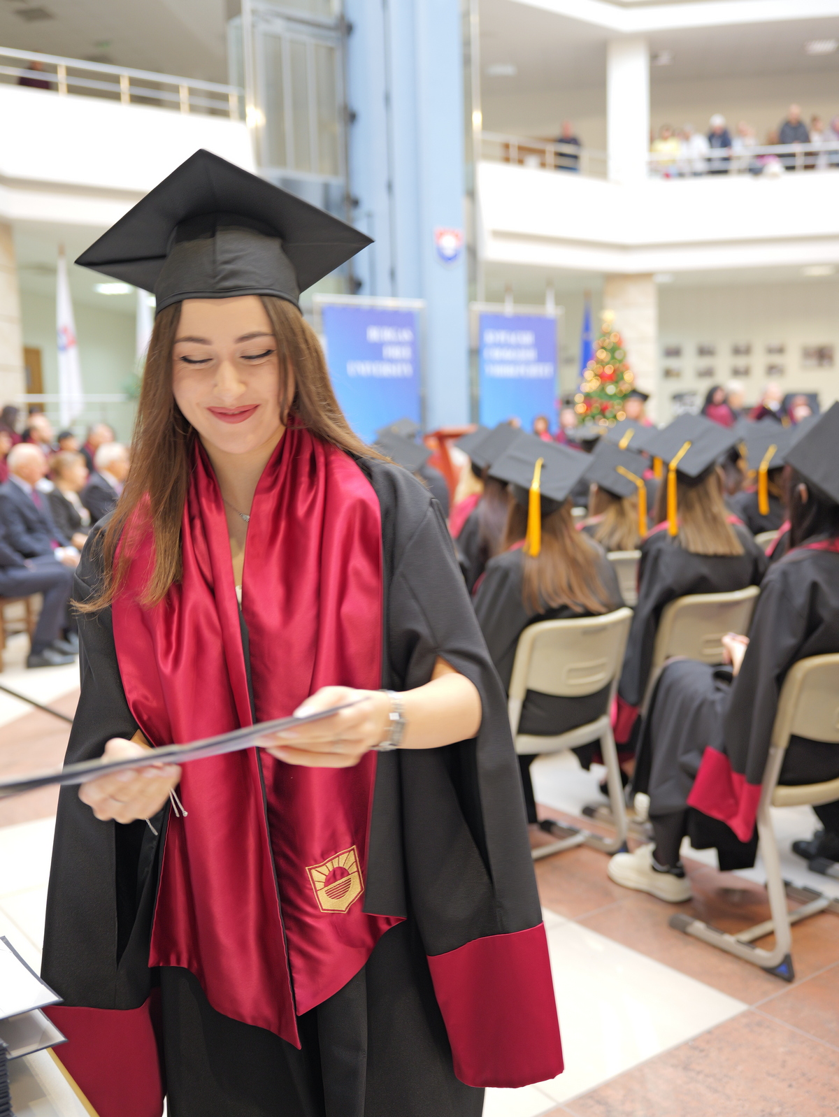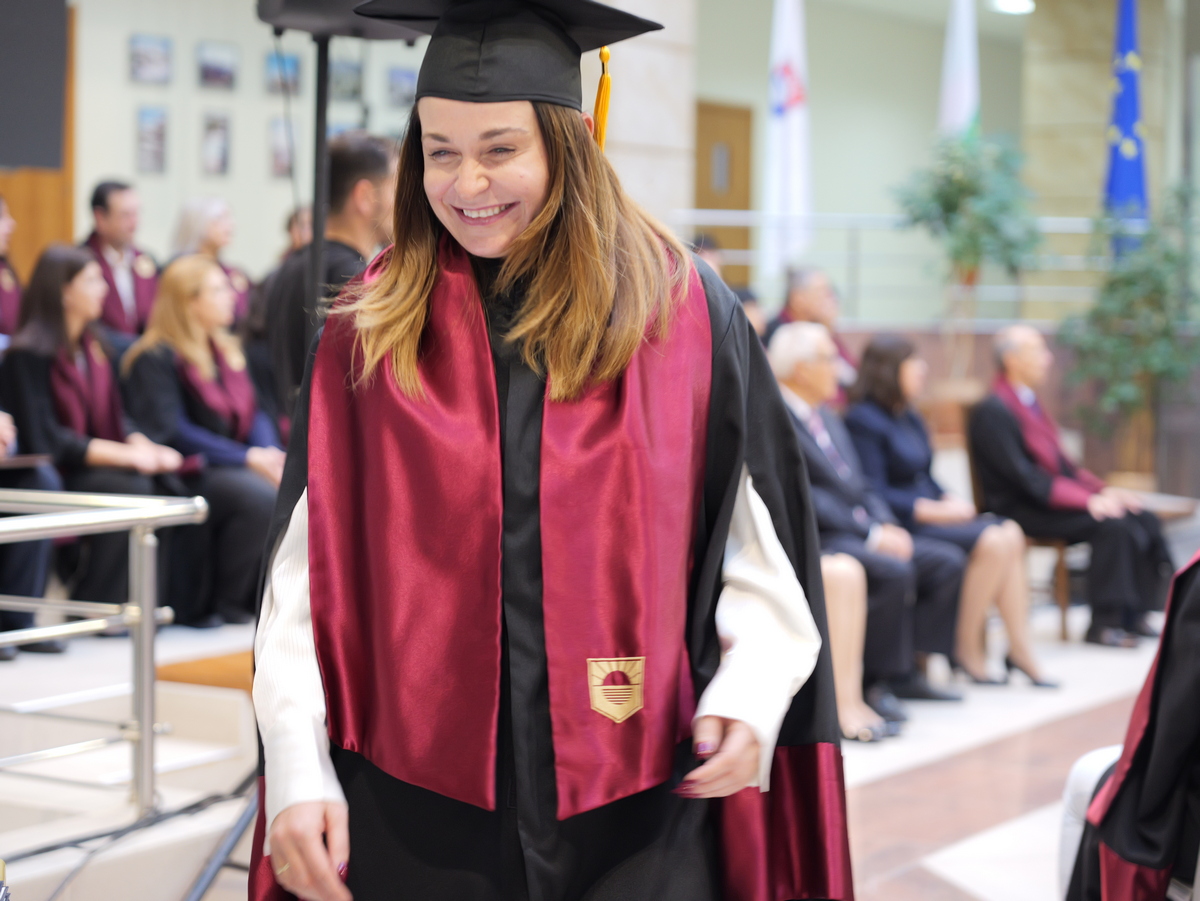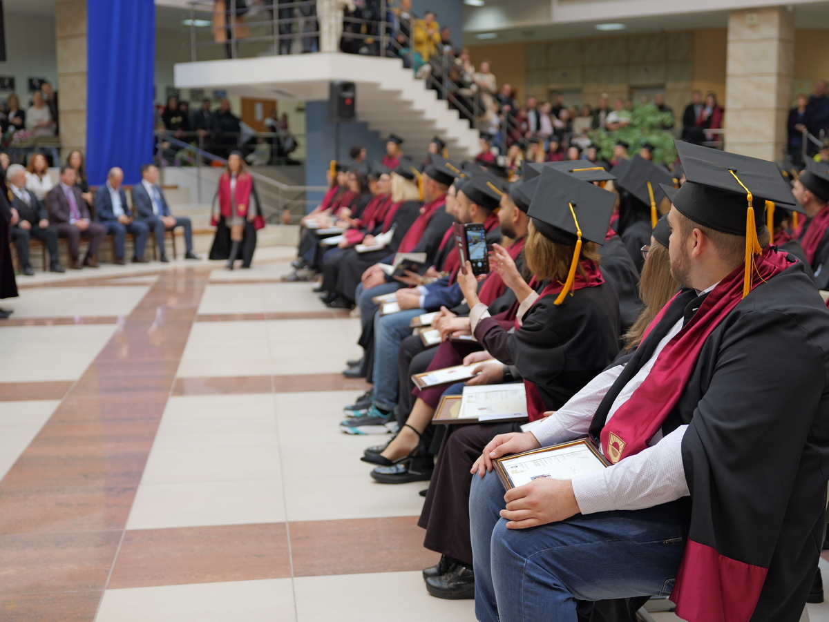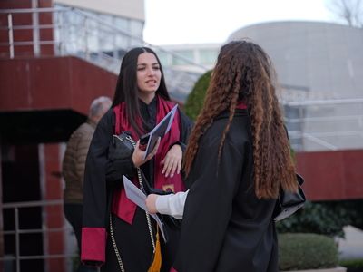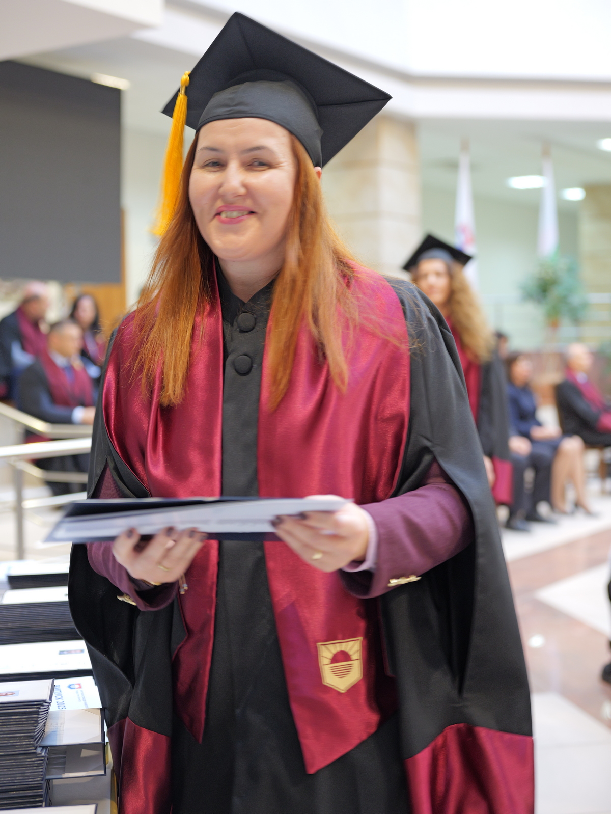 От името на абсолвентите приветствие поднесе Аля Казанджиева, магистър от специалност „Иновации и предприемачество в началното и предучилищното образование“ „Всеки от нас влиза в университета изпълнен с мечти и амбиции. Днес си тръгваме като личности, развили се чрез усилия, дисциплина, вдъхновение и непрекъснато учене. Пътят беше предизвикателен, но именно тези предизвикателства ни изградиха, както и подкрепата, насоките и отдадеността на нашите преподаватели, които стояха до нас през всяка стъпка от този път“ – каза в приветствието си Аля Казанджиева.