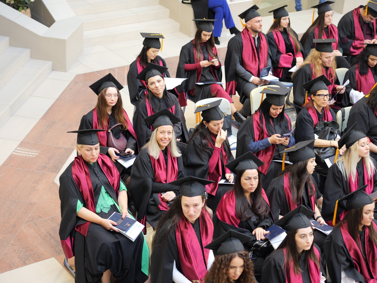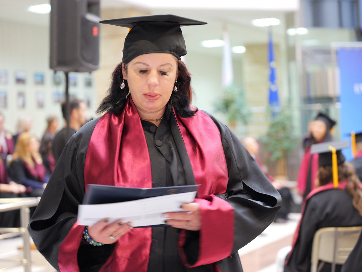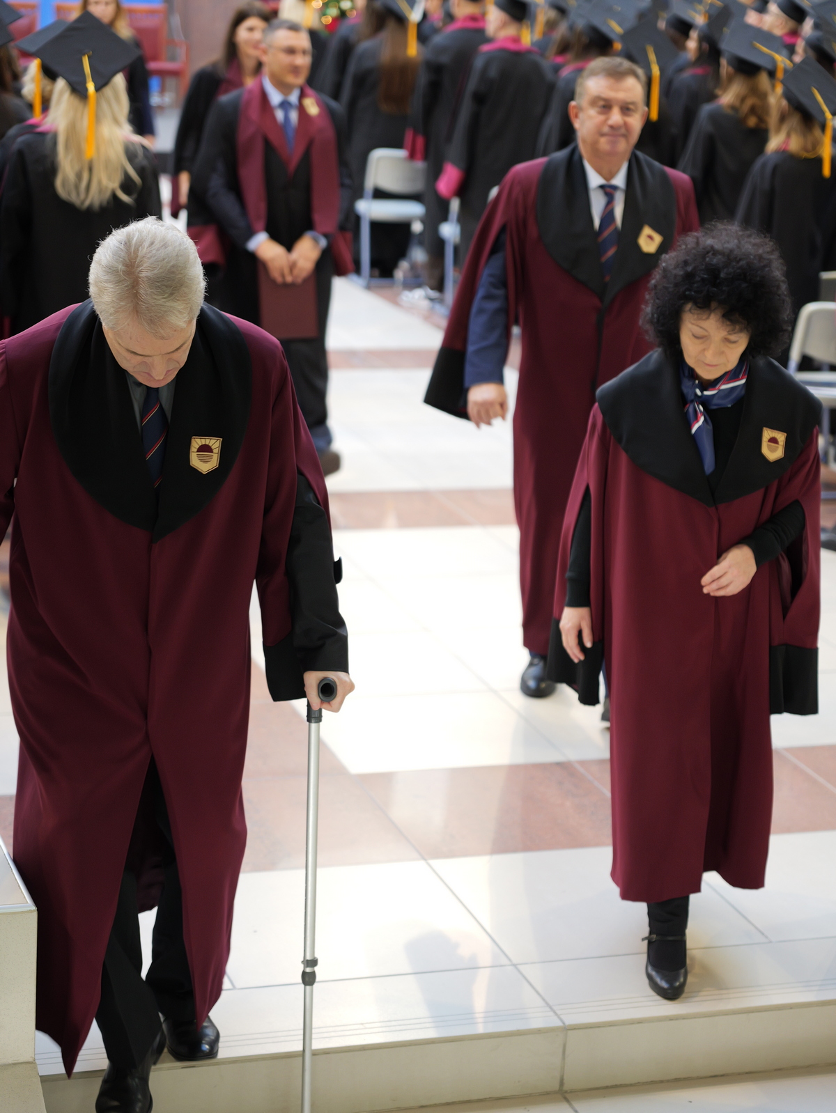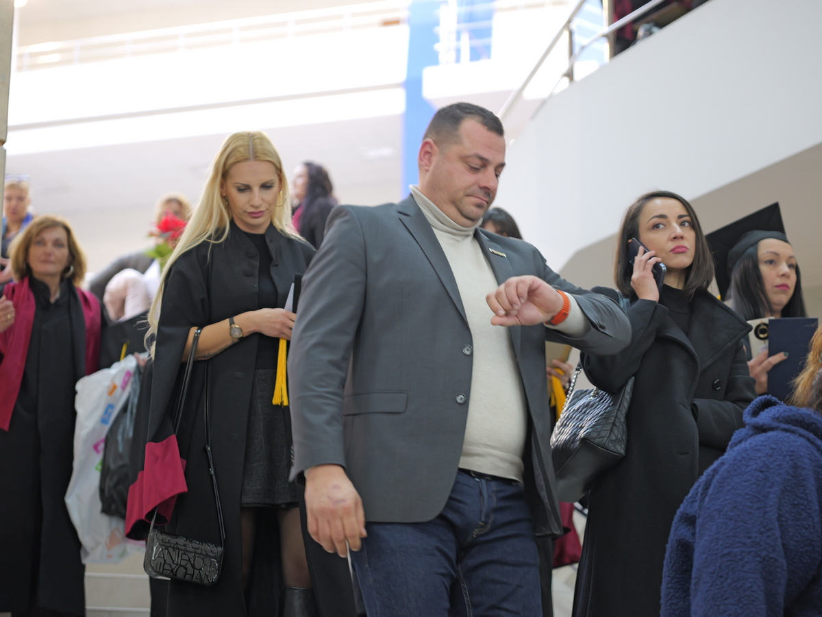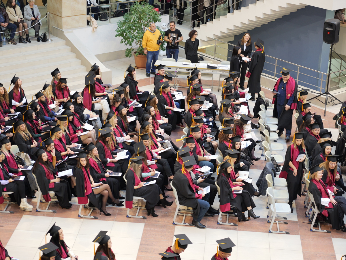 От името на абсолвентите приветствие поднесе Аля Казанджиева, магистър от специалност „Иновации и предприемачество в началното и предучилищното образование“ „Всеки от нас влиза в университета изпълнен с мечти и амбиции. Днес си тръгваме като личности, развили се чрез усилия, дисциплина, вдъхновение и непрекъснато учене. Пътят беше предизвикателен, но именно тези предизвикателства ни изградиха, както и подкрепата, насоките и отдадеността на нашите преподаватели, които стояха до нас през всяка стъпка от този път“ – каза в приветствието си Аля Казанджиева.