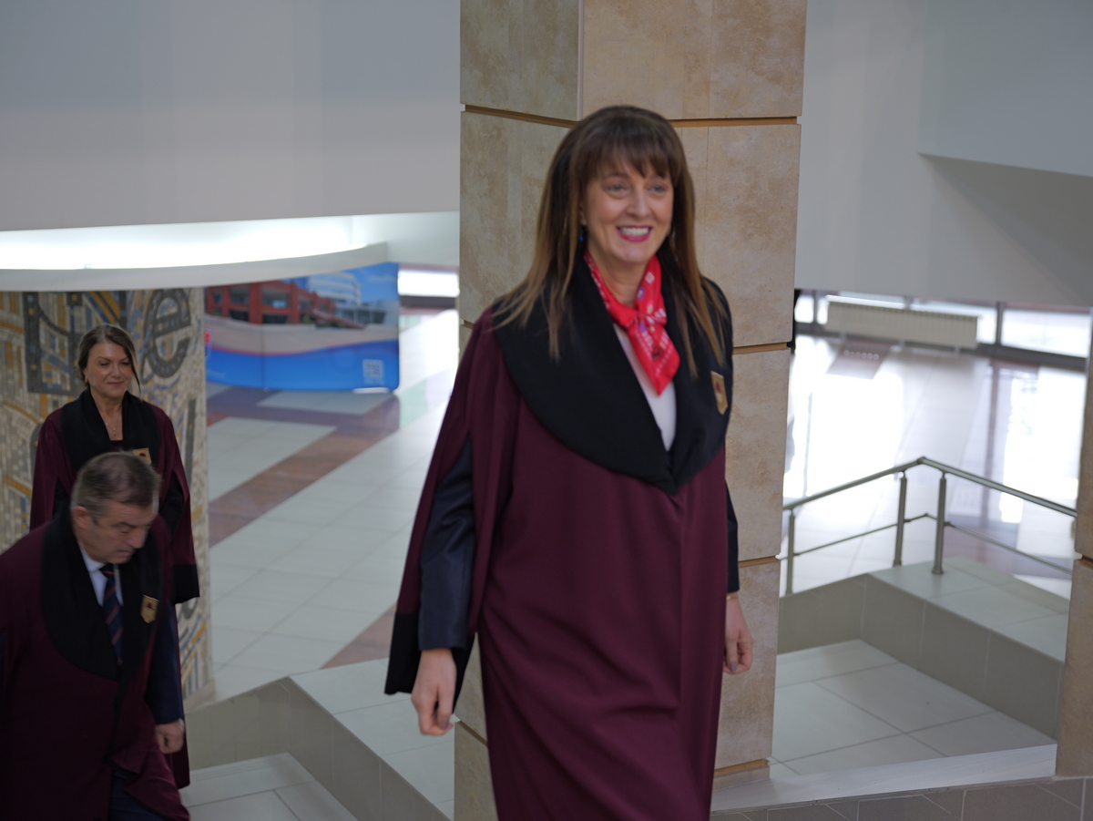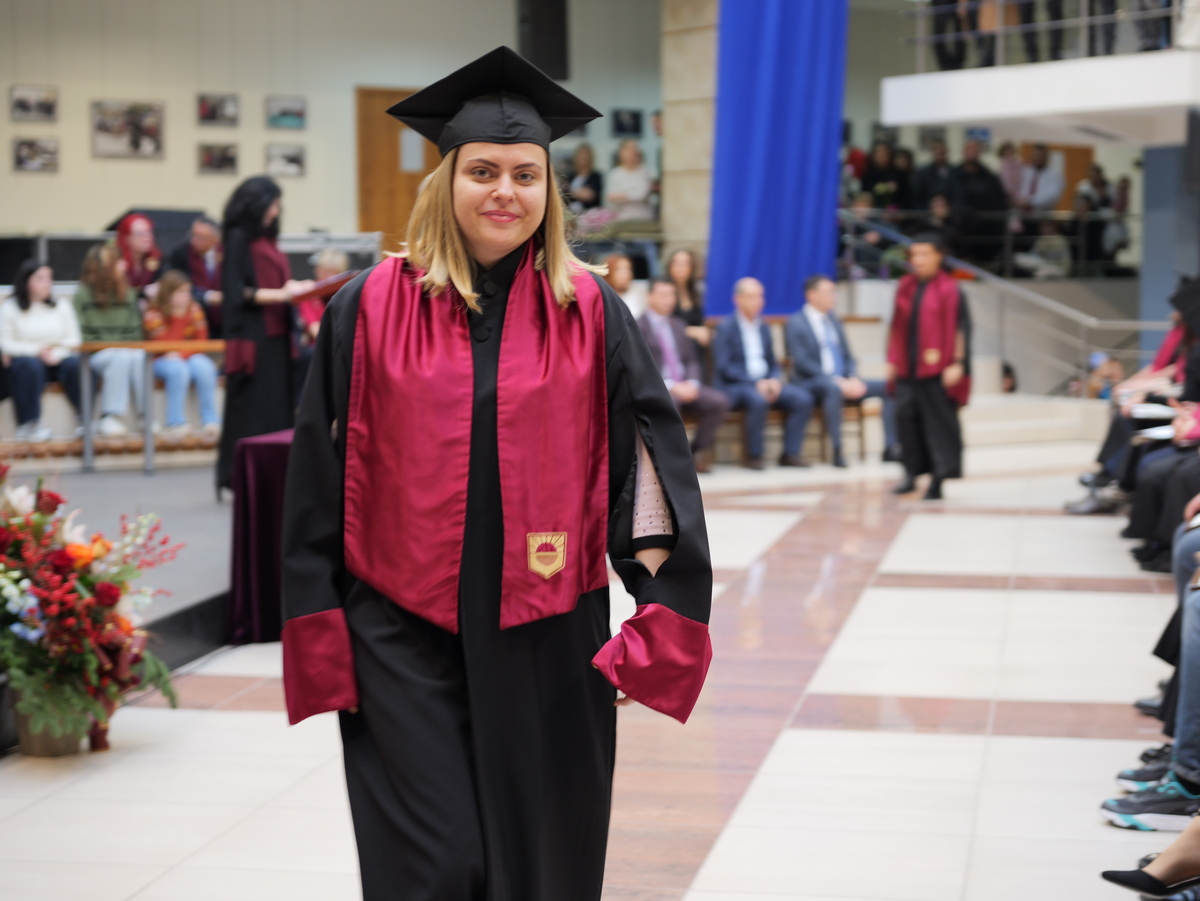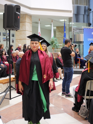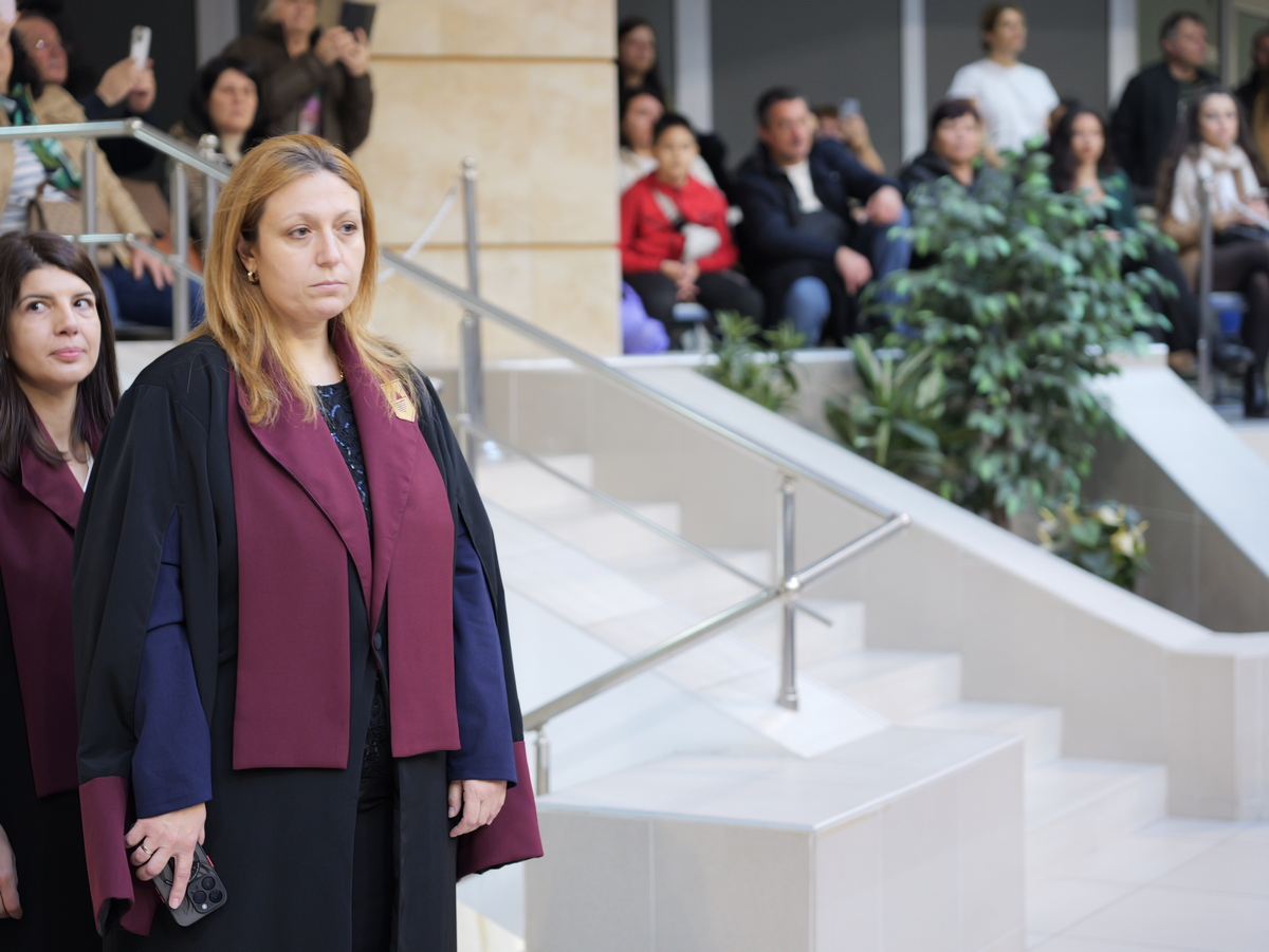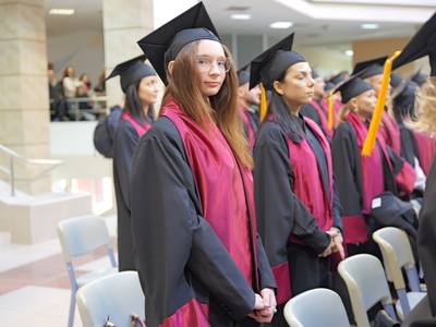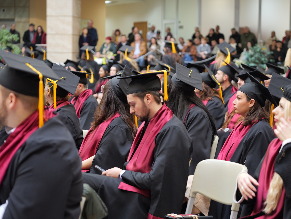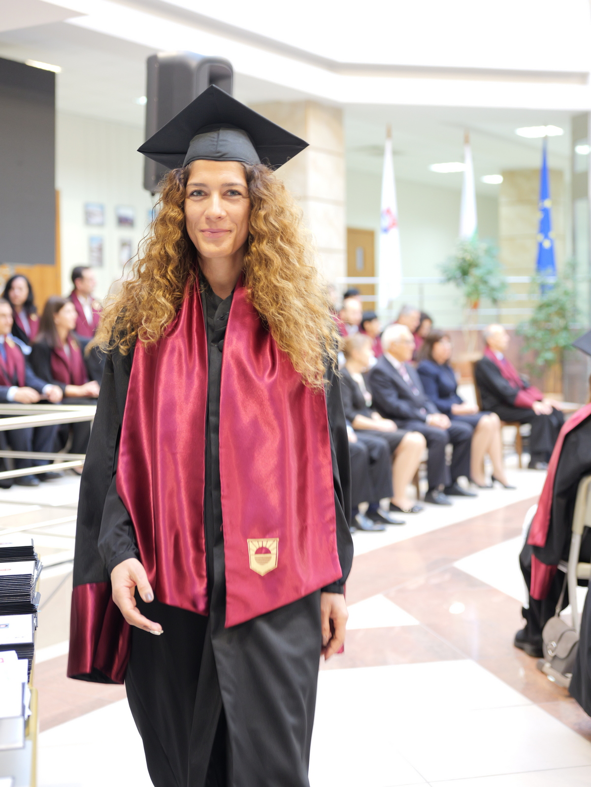 От името на абсолвентите приветствие поднесе Аля Казанджиева, магистър от специалност „Иновации и предприемачество в началното и предучилищното образование“ „Всеки от нас влиза в университета изпълнен с мечти и амбиции. Днес си тръгваме като личности, развили се чрез усилия, дисциплина, вдъхновение и непрекъснато учене. Пътят беше предизвикателен, но именно тези предизвикателства ни изградиха, както и подкрепата, насоките и отдадеността на нашите преподаватели, които стояха до нас през всяка стъпка от този път“ – каза в приветствието си Аля Казанджиева.