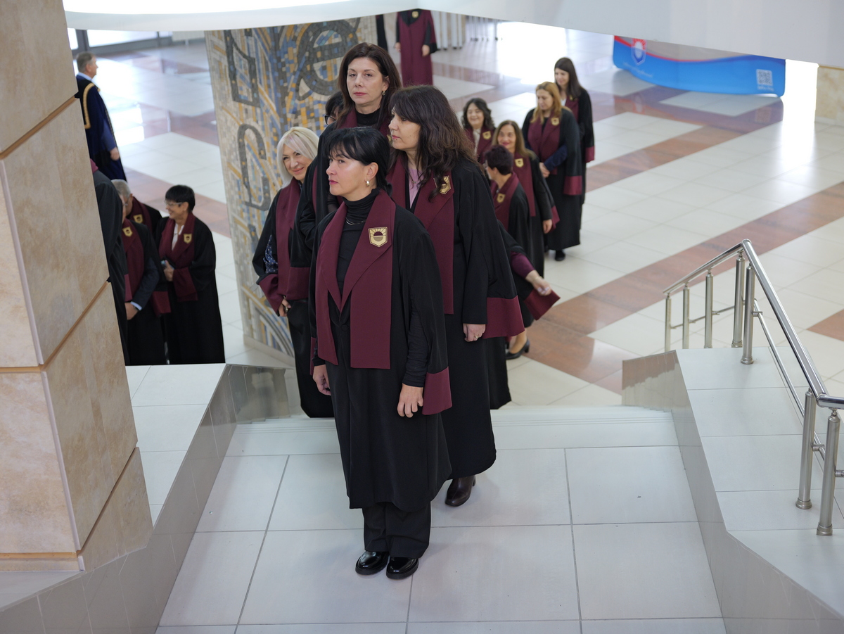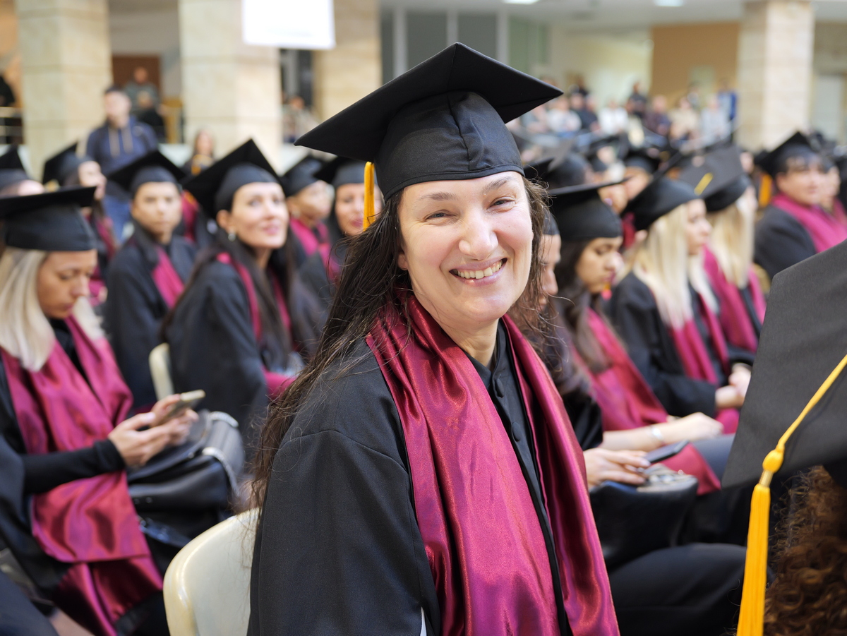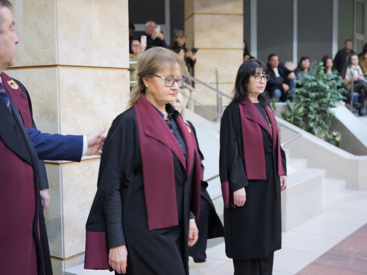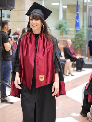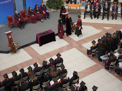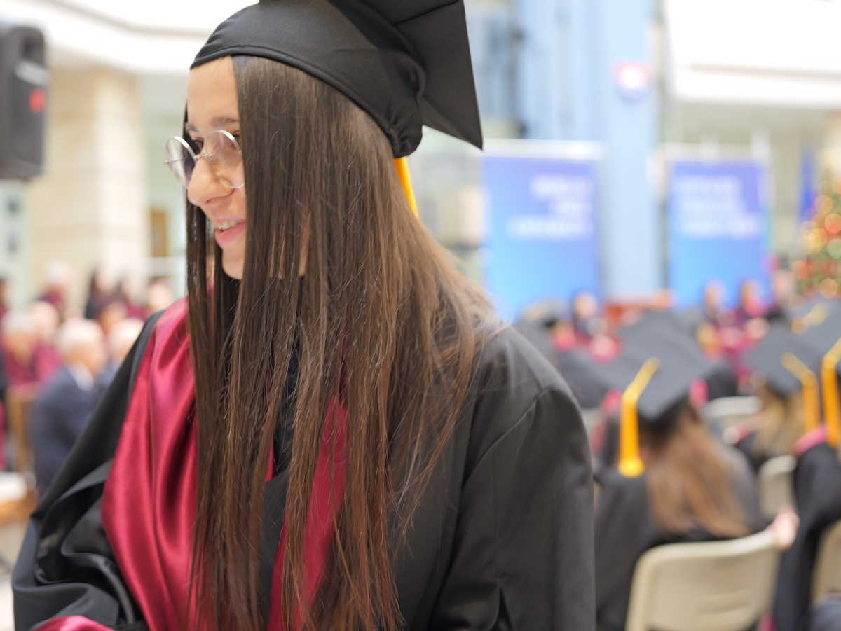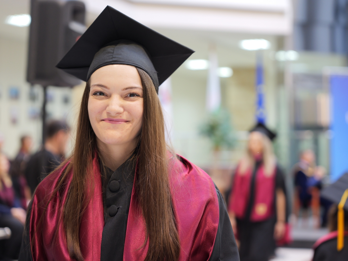 От името на абсолвентите приветствие поднесе Аля Казанджиева, магистър от специалност „Иновации и предприемачество в началното и предучилищното образование“ „Всеки от нас влиза в университета изпълнен с мечти и амбиции. Днес си тръгваме като личности, развили се чрез усилия, дисциплина, вдъхновение и непрекъснато учене. Пътят беше предизвикателен, но именно тези предизвикателства ни изградиха, както и подкрепата, насоките и отдадеността на нашите преподаватели, които стояха до нас през всяка стъпка от този път“ – каза в приветствието си Аля Казанджиева.