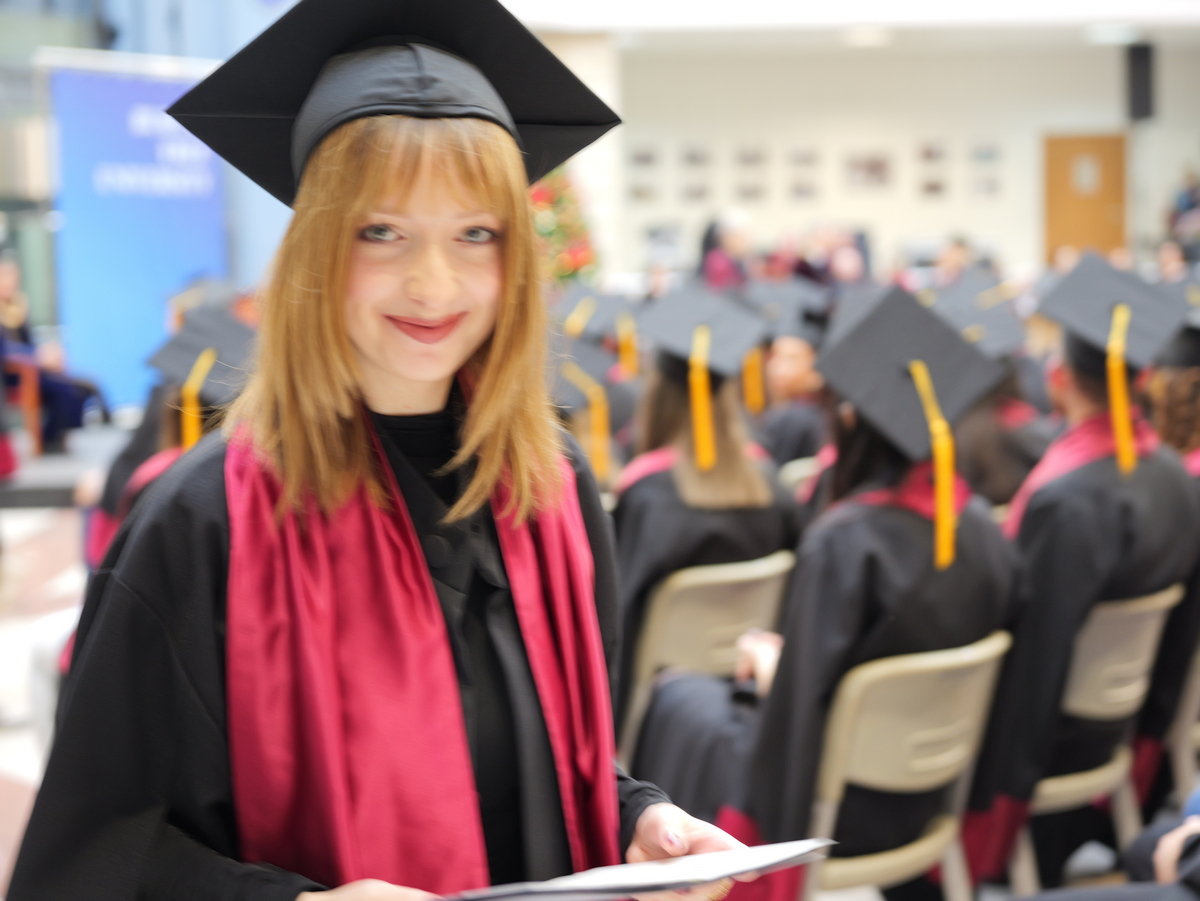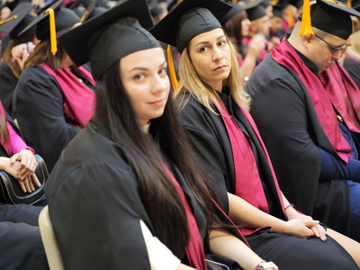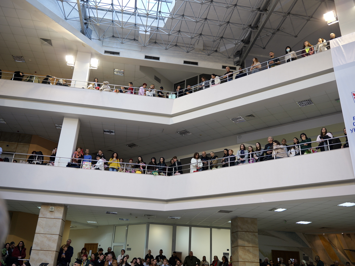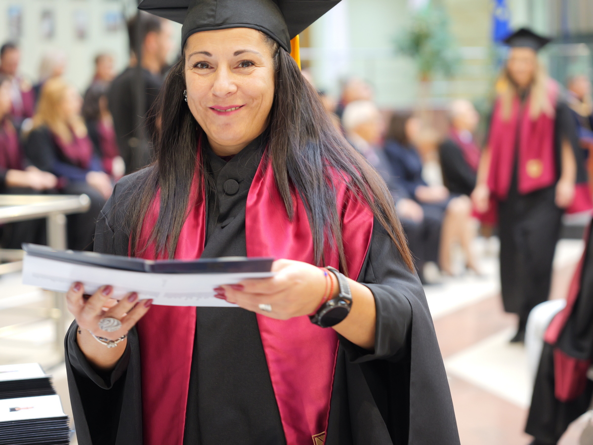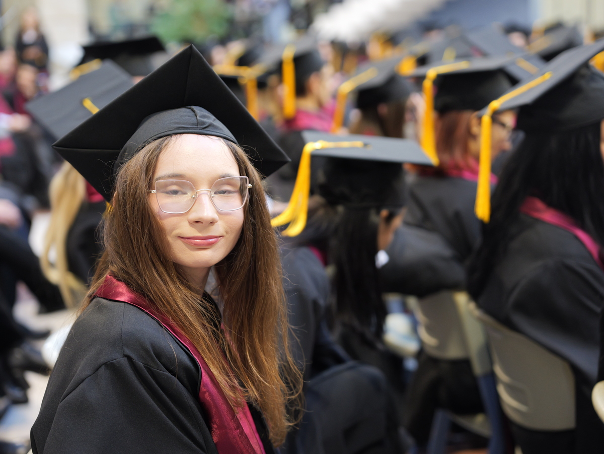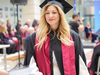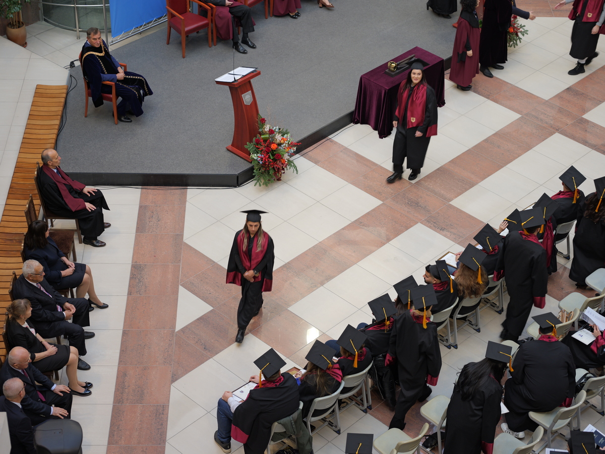 От името на абсолвентите приветствие поднесе Аля Казанджиева, магистър от специалност „Иновации и предприемачество в началното и предучилищното образование“ „Всеки от нас влиза в университета изпълнен с мечти и амбиции. Днес си тръгваме като личности, развили се чрез усилия, дисциплина, вдъхновение и непрекъснато учене. Пътят беше предизвикателен, но именно тези предизвикателства ни изградиха, както и подкрепата, насоките и отдадеността на нашите преподаватели, които стояха до нас през всяка стъпка от този път“ – каза в приветствието си Аля Казанджиева.