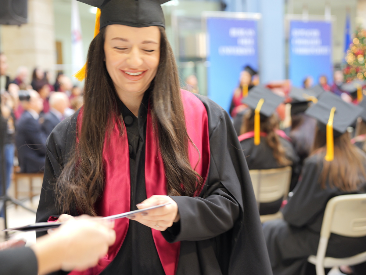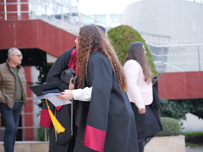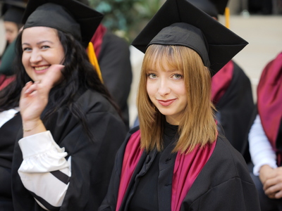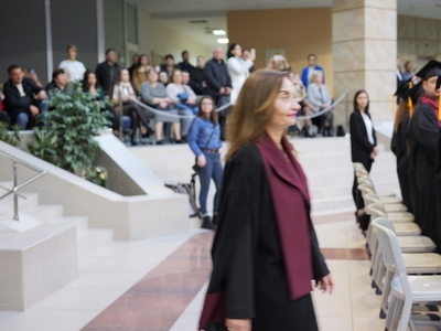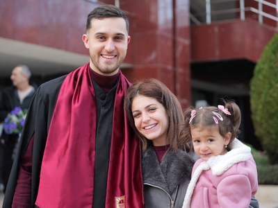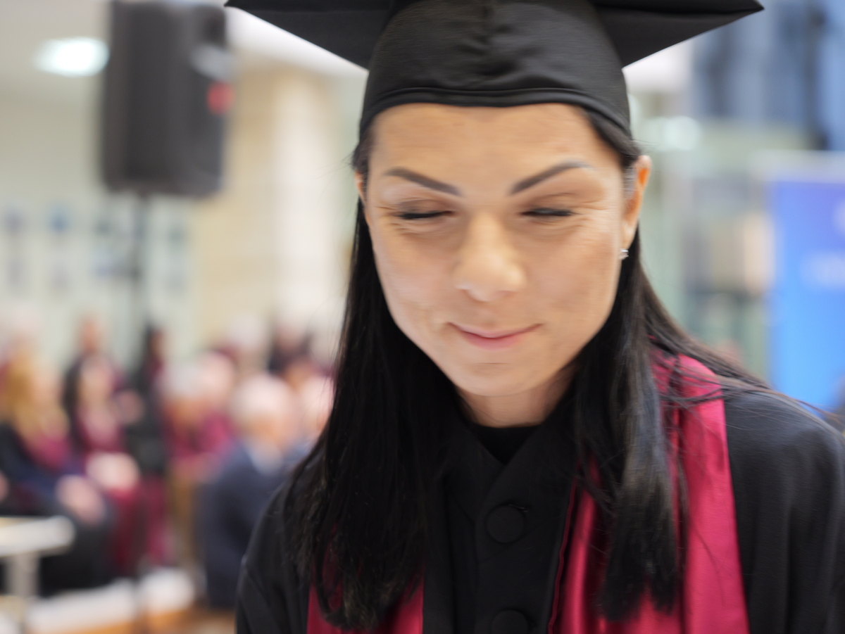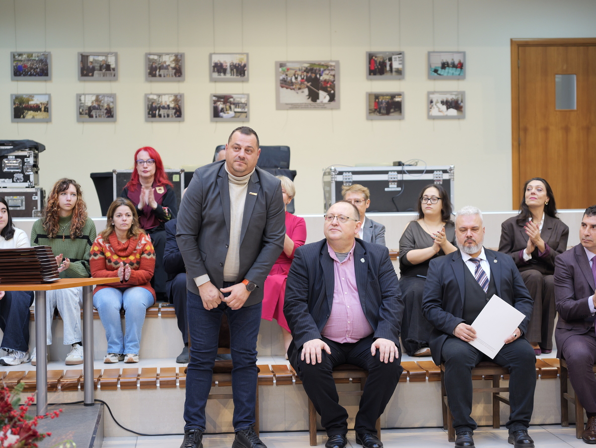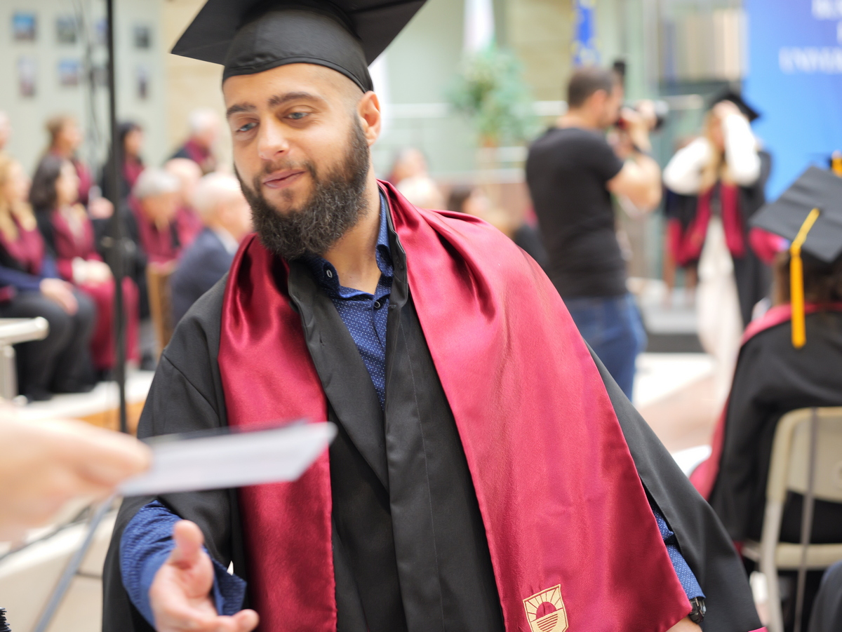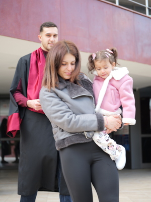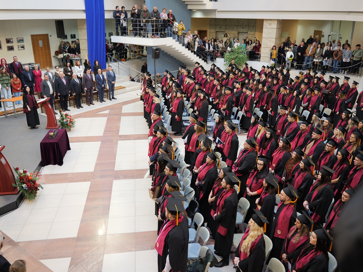 От името на абсолвентите приветствие поднесе Аля Казанджиева, магистър от специалност „Иновации и предприемачество в началното и предучилищното образование“ „Всеки от нас влиза в университета изпълнен с мечти и амбиции. Днес си тръгваме като личности, развили се чрез усилия, дисциплина, вдъхновение и непрекъснато учене. Пътят беше предизвикателен, но именно тези предизвикателства ни изградиха, както и подкрепата, насоките и отдадеността на нашите преподаватели, които стояха до нас през всяка стъпка от този път“ – каза в приветствието си Аля Казанджиева.