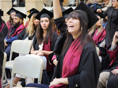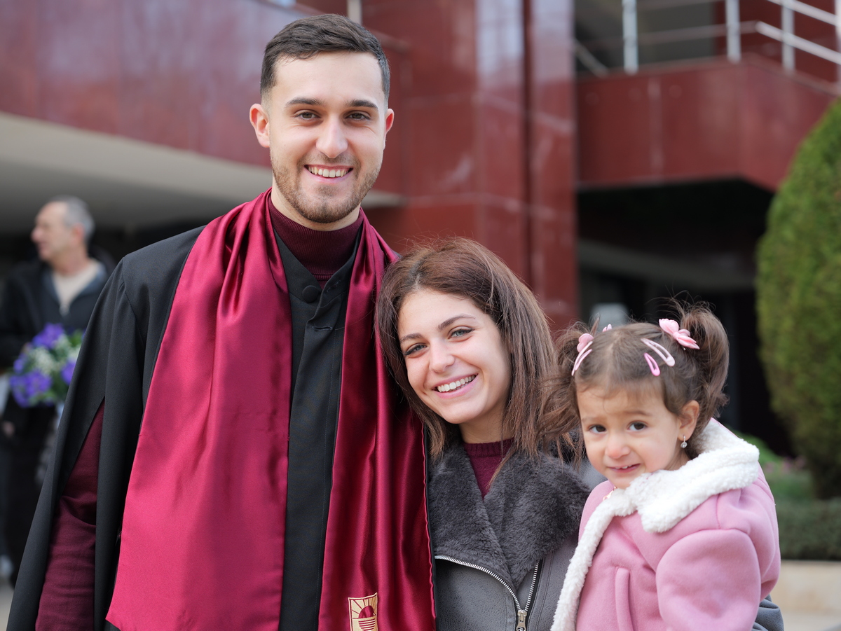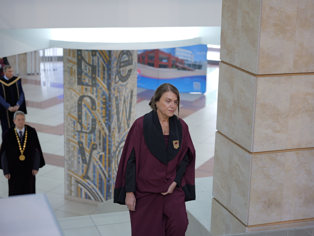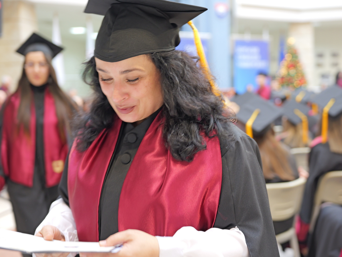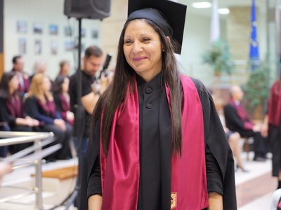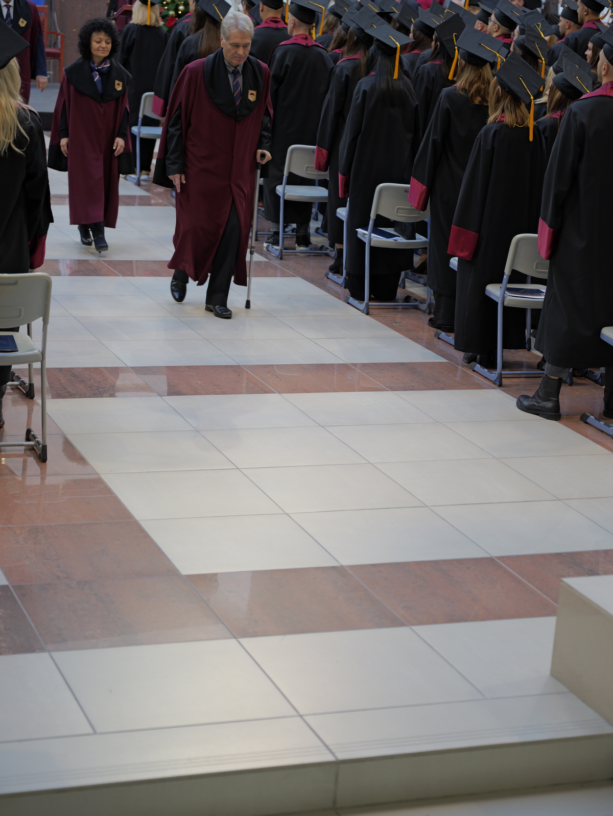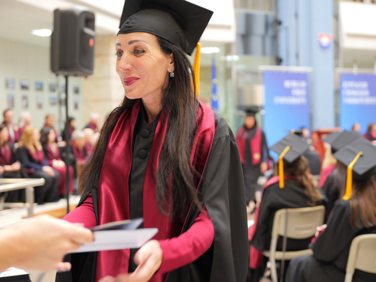 От името на абсолвентите приветствие поднесе Аля Казанджиева, магистър от специалност „Иновации и предприемачество в началното и предучилищното образование“ „Всеки от нас влиза в университета изпълнен с мечти и амбиции. Днес си тръгваме като личности, развили се чрез усилия, дисциплина, вдъхновение и непрекъснато учене. Пътят беше предизвикателен, но именно тези предизвикателства ни изградиха, както и подкрепата, насоките и отдадеността на нашите преподаватели, които стояха до нас през всяка стъпка от този път“ – каза в приветствието си Аля Казанджиева.