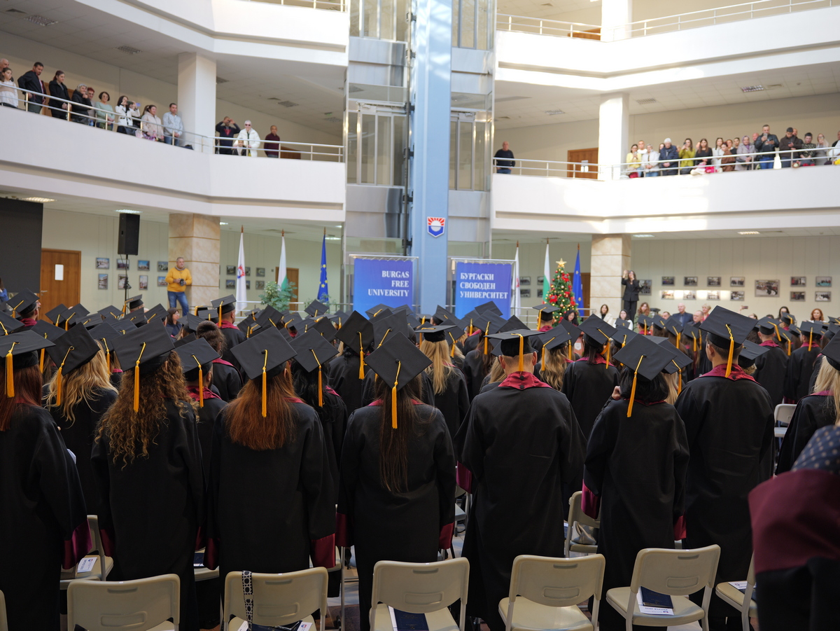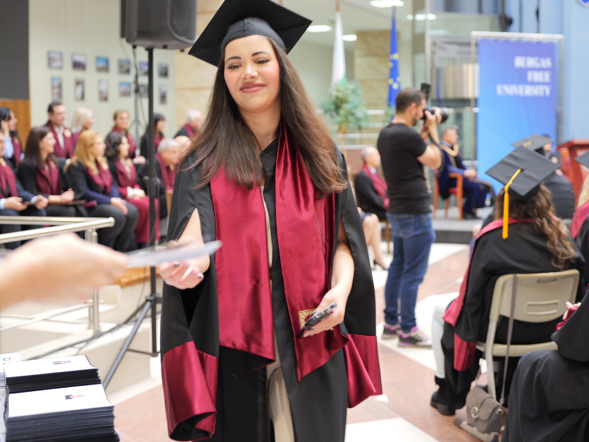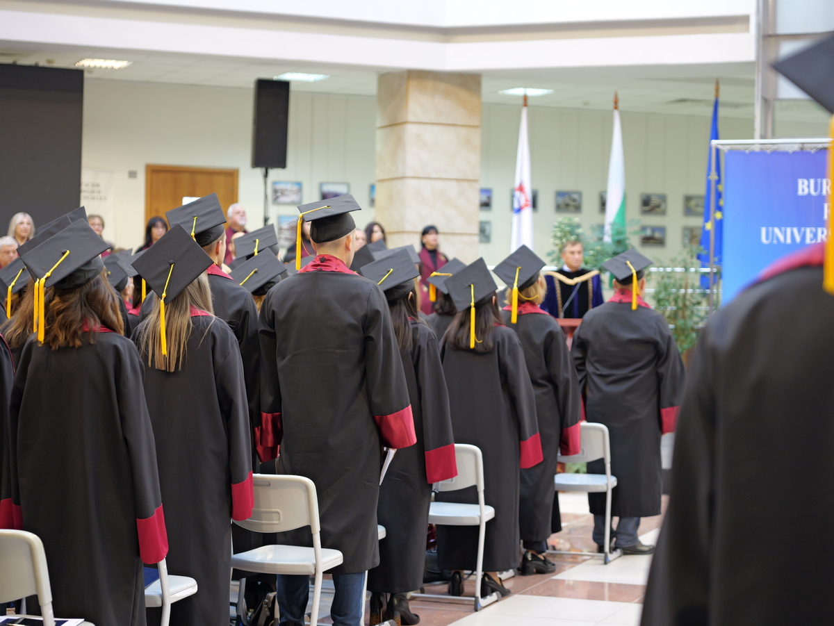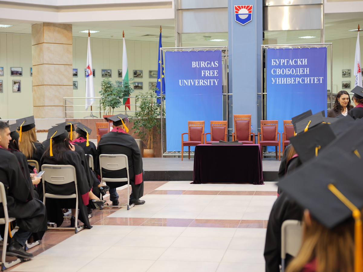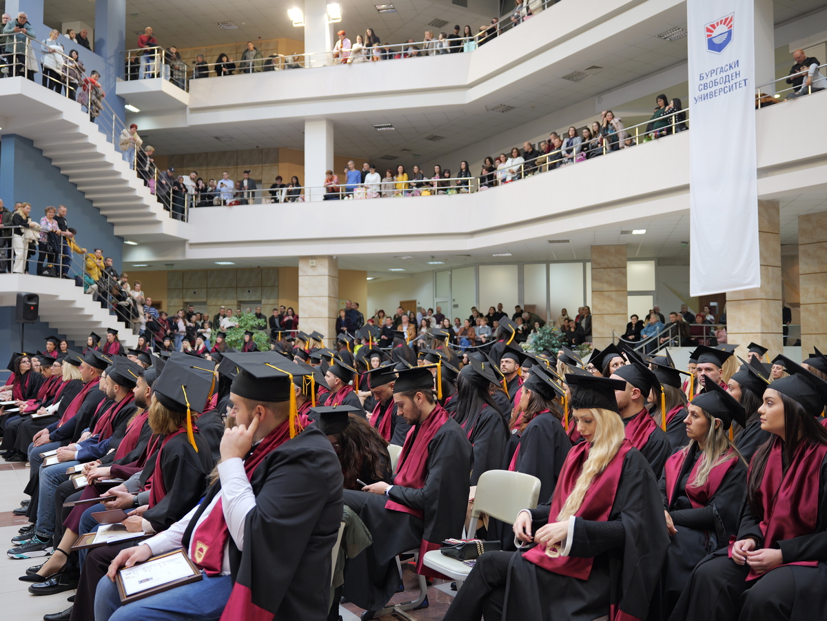 Над 350 абсолвенти от 13 бакалавърски специалности и 26 магистърски програми от Бургаския свободен университет символично поставиха крайната точка на едно красиво и ползотворно академично пътешествие. По време на празнична церемония те получиха своите дипломи в Атриума на БСУ. Свидетелства за отличие и доказан стремеж за издигане авторитета на академичната общност получиха и 30 изявени абсолвенти.