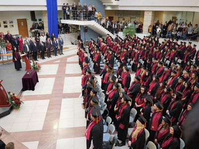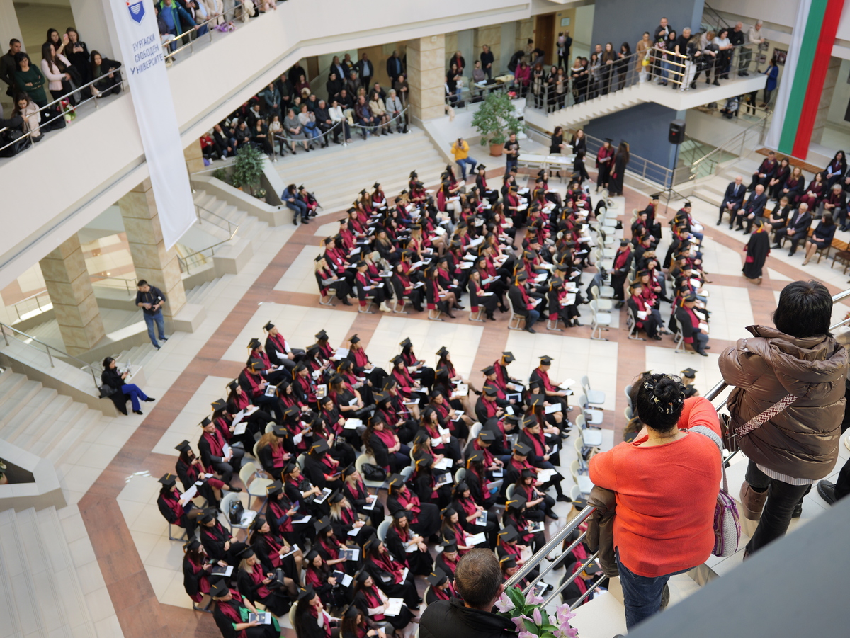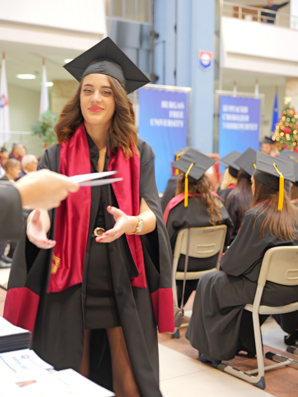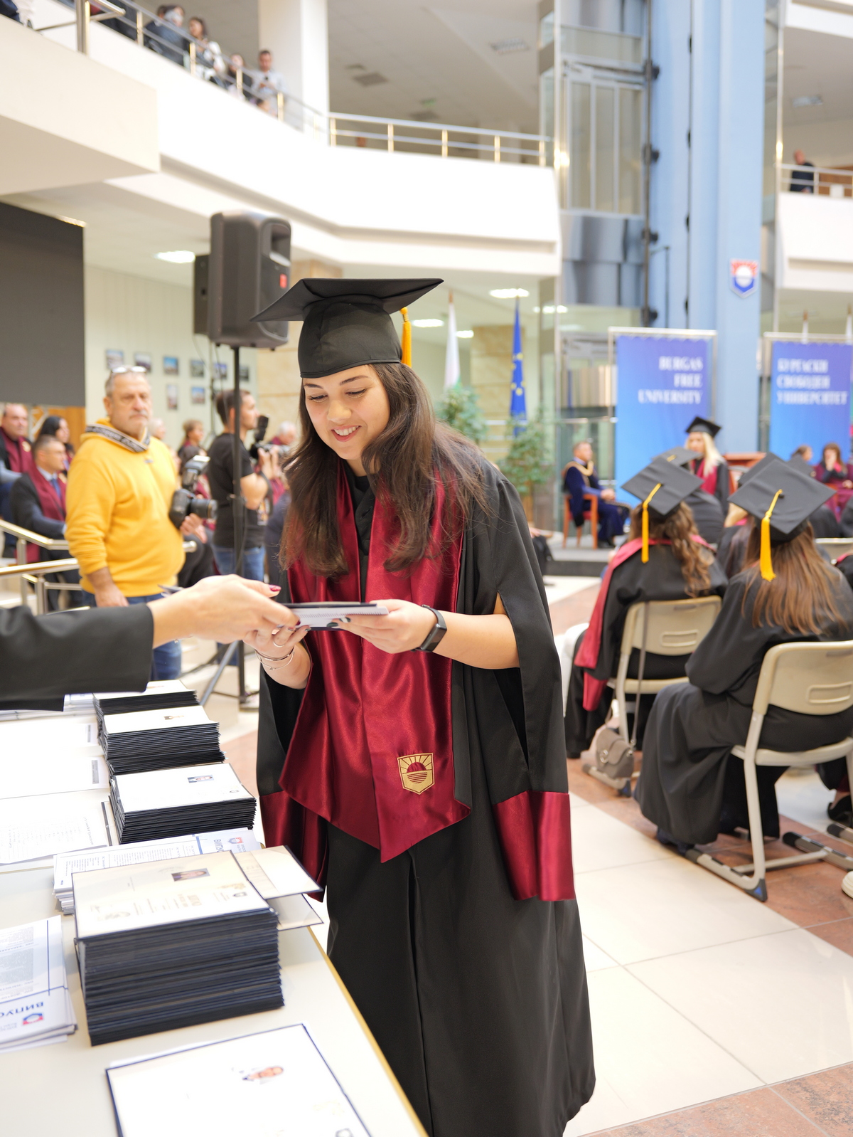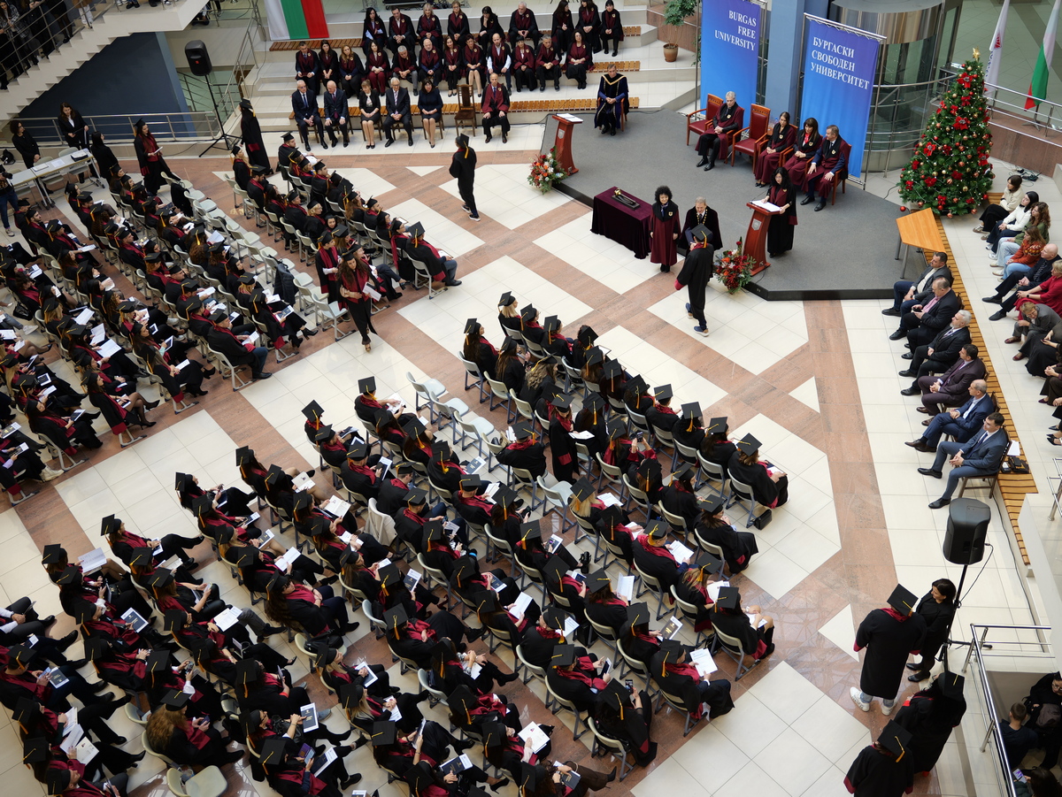 Над 350 абсолвенти от 13 бакалавърски специалности и 26 магистърски програми от Бургаския свободен университет символично поставиха крайната точка на едно красиво и ползотворно академично пътешествие. По време на празнична церемония те получиха своите дипломи в Атриума на БСУ. Свидетелства за отличие и доказан стремеж за издигане авторитета на академичната общност получиха и 30 изявени абсолвенти.