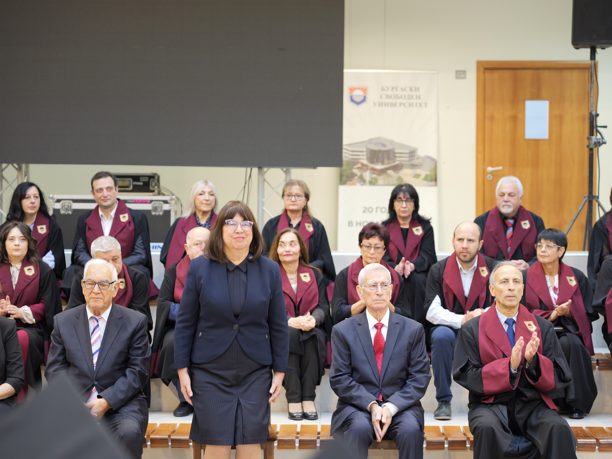 Президентът Румен Радев също изпрати поздравителен адрес по случай тържествената церемония. В него държавният глава подчертава значимостта на БСУ в образователната система у нас. „От създаването си до днес Вашият университет утвърди своя авторитет, изгради една от най-модерните учебни бази у нас и успя да развие собствен академичен модел на основата на новаторски подходи. Днес БСУ осигурява образователна подготовка в широк спектър специалности, а колективът му реализира значима научноизследователска продукция“, се казва още в поздравителния адрес.