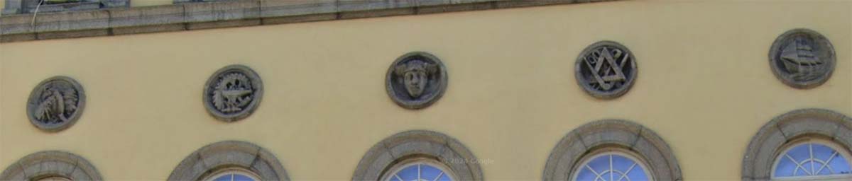 Вляво е фигура, която подозрително много наподобява зеленчуци и е символ на занаят, свързан със земеделието. Вдясно от нея виждаме зъбно колело и нещо като наковалня - символ на индустрията, производството и труда. В центъра е глава, вероятно женска, с шлем и най-вероятно символизира изкуствата. Възможно е да е божеството Меркурий, което е повелител на търговията. Вдясно от нея виждаме нещо, което много наподобява масонски символ - със сигурност има триъгълник и пергел, които са символи на строителството и инженерните професии като цяло. Последният, най-десен релеф, е кораб - универсалният символ на търговията по море.