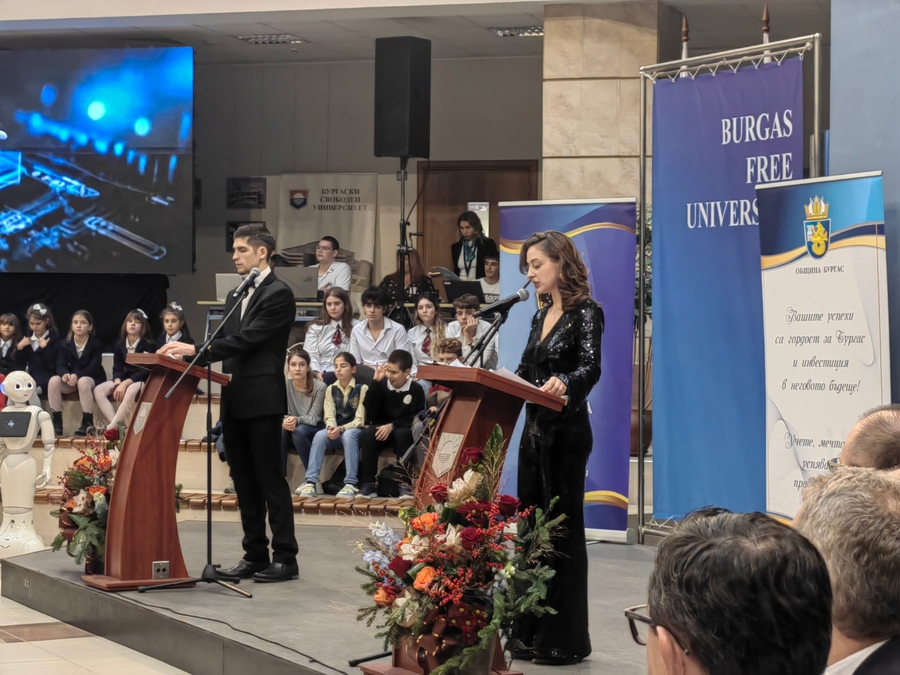 Водещи на събитието бяха студентите от Театралния колеж "Любен Гройс". А в празничната програма бяха включени танцово изпълнение и поздрав от бъдещото - с образователен робот.