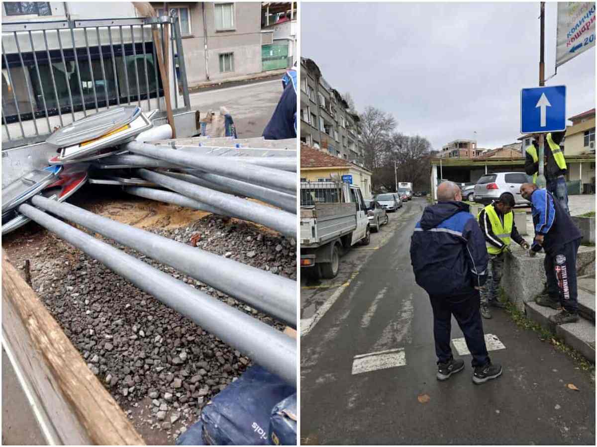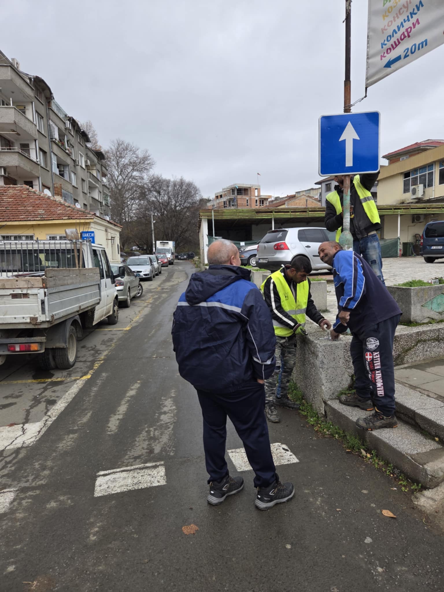 Сутринта работниците от отдел „Благоустрояване“ на Общинската администрация започнаха работа по поставянето на вертикалната маркировка в централна градска част. Забранителни и задължителни пътни знаци вече са поставени на ул. „Димитър Зехирев“, ул „Лъдженска“ и свързани с тях съседни улици. Знаците са за еднопосочно движение, за забранено влизане, паркиране, престой и т.н.
