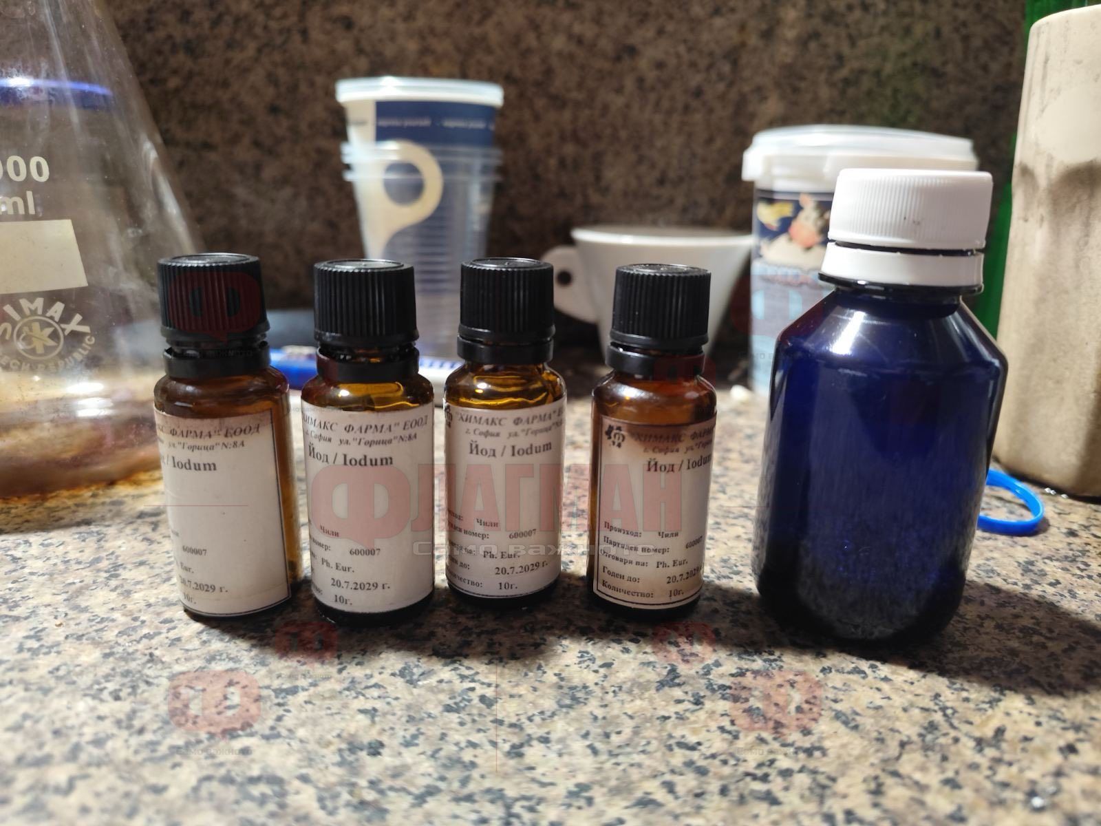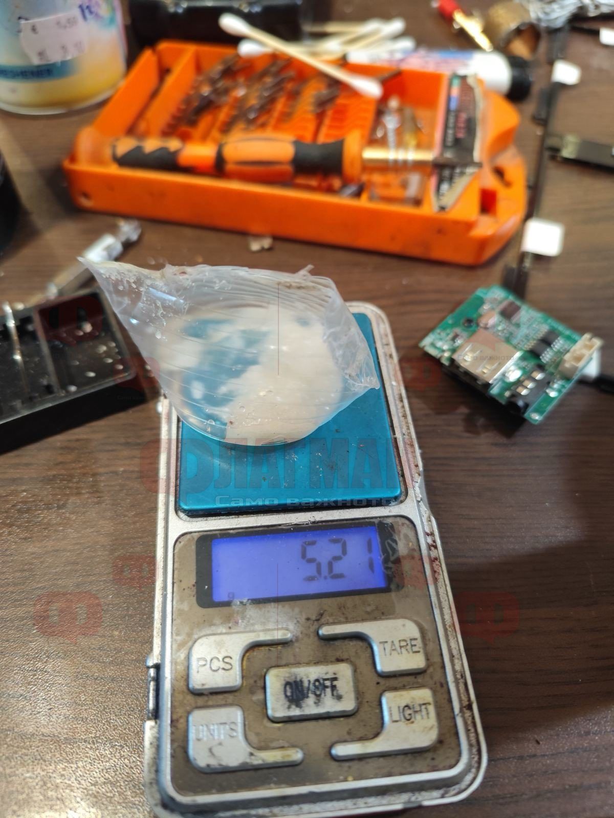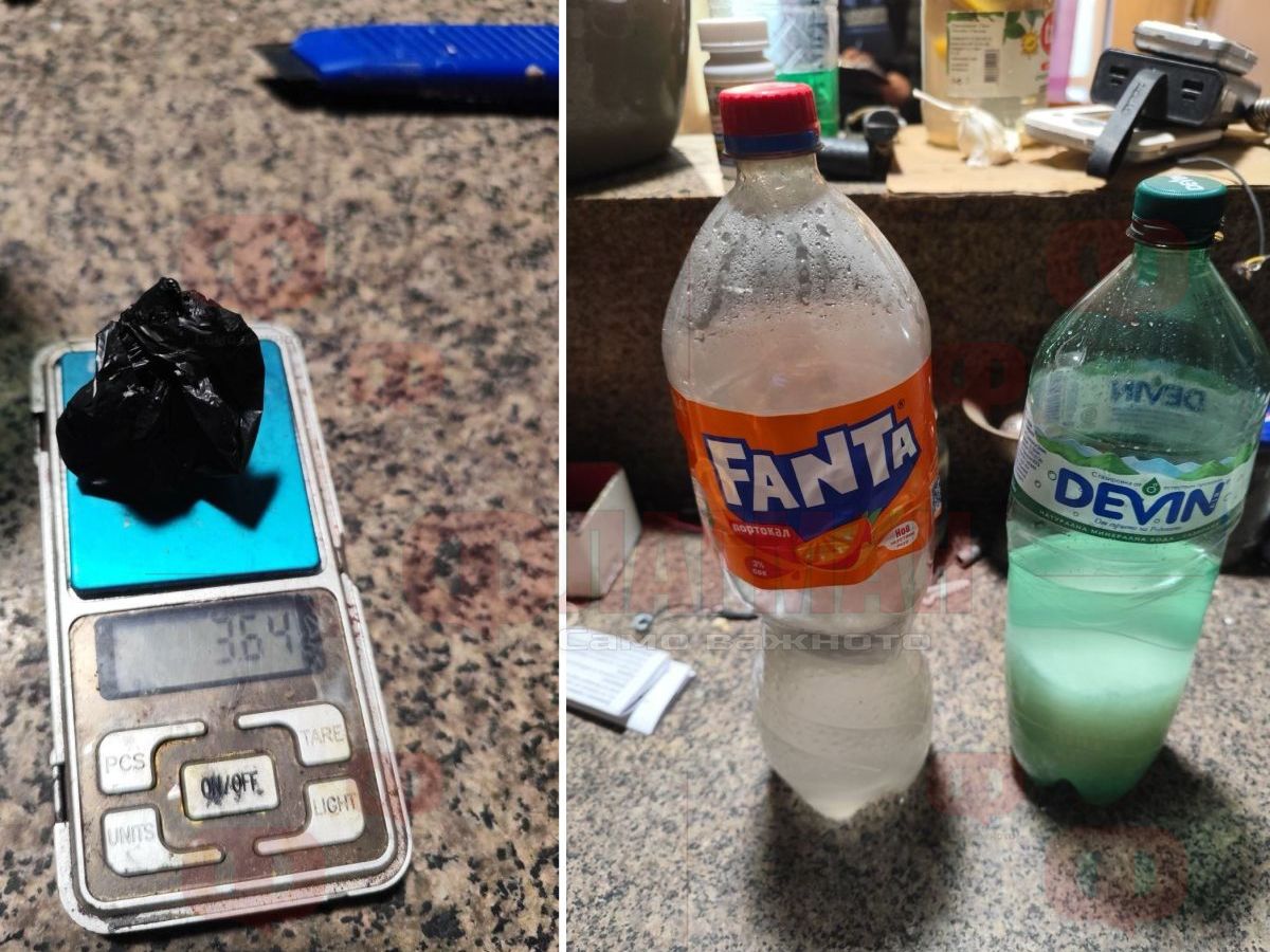 По време на обиска в частния дом са намерени две пластмасови бутилки с вместимост 1,5 литра, съдържащи безцветна течност, която при направен полеви наркотест е реагирала на метамфетамин. Освен това е иззета чаша с бяло кристалообразно вещество с тегло около 10 грама, също идентифицирано като метамфетамин.