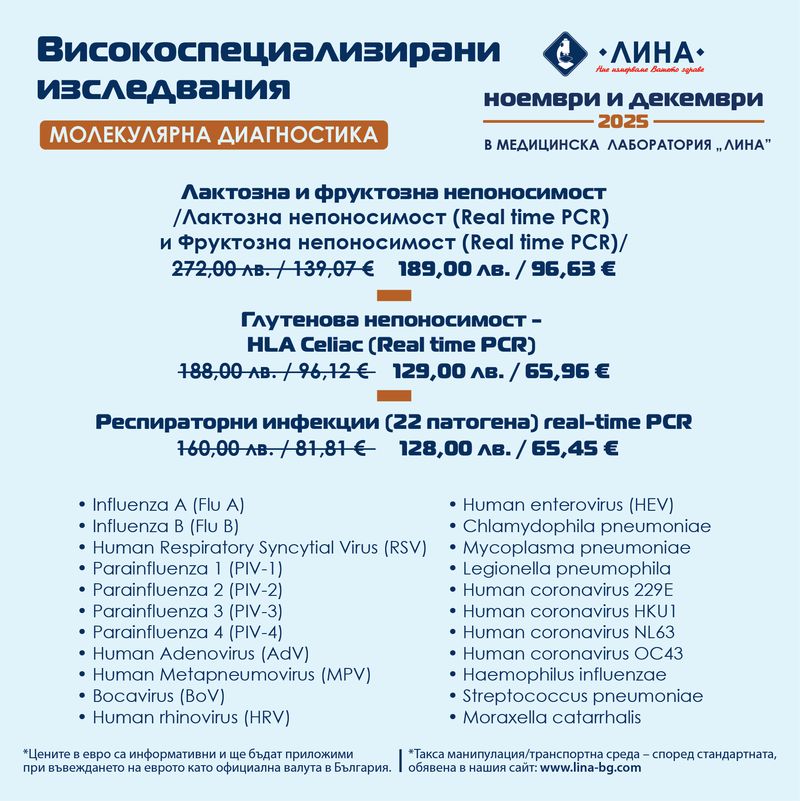 До края на декември 2025 г. лаборатория „ЛИНА“ насочва вниманието към четири високоспециализирани PCR изследвания, които подпомагат навременното откриване на – лактозна и фруктозна непоносимост; глутенова непоносимост (HLA Celiac) и респираторни инфекции (22 патогена).