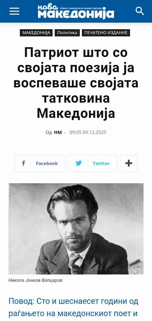 „В България този македонски патриот, влюбен в Македония, днес се представя като български поет и „българин по род“, тъй като писал на български език. Макар че Вапцаров в своята поезия възпява единствено своята родина Македония, а не България, която го е убила.“