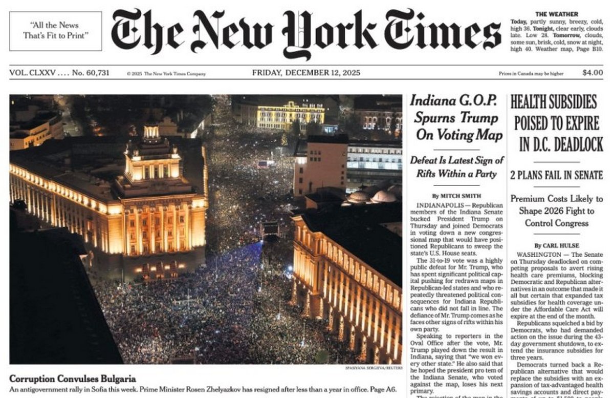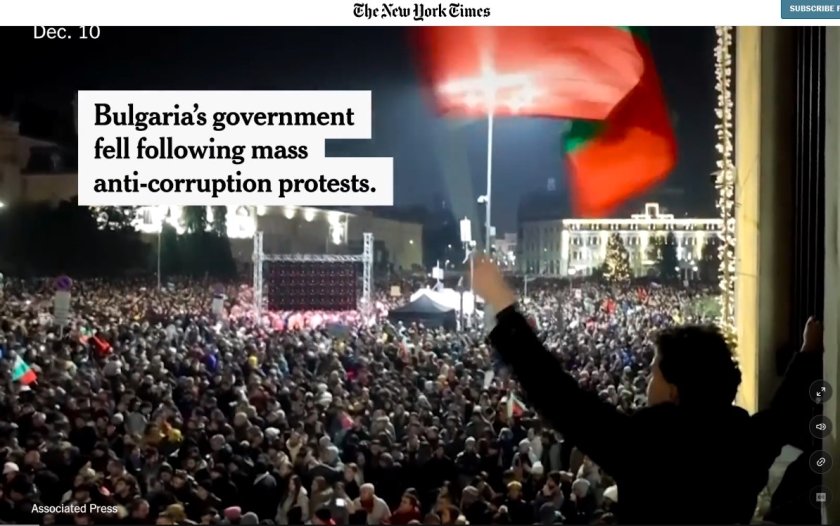 Мащабните протести срещу кабинета на Росен Желязков в България бяха поставени на първа страница от авторитетния вестник „Ню Йорк Таймс“.