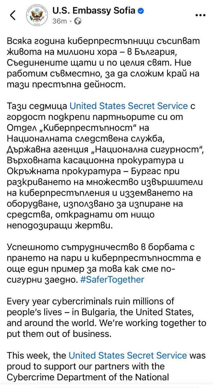 „Успешното сътрудничество в борбата с прането на пари и киберпрестъпността е още един пример за това как сме по-сигурни заедно“, се посочва в официално изявление, публикувано на страницата на Посолството на САЩ в София.