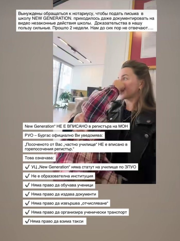 Това можели да го гарантират и всички родители, които са записали децата си в New Generation School - 40 ученици имало до 7-ми клас и 20-ина в гимназиален етап. "Анастасия раздуха този скандал в Инстаграм. Родителите започнаха да й отговарят, че пише неверни неща и измислици за образователния център, но тя триеше всеки коментар, който не хареса", твърди Мария Царева.