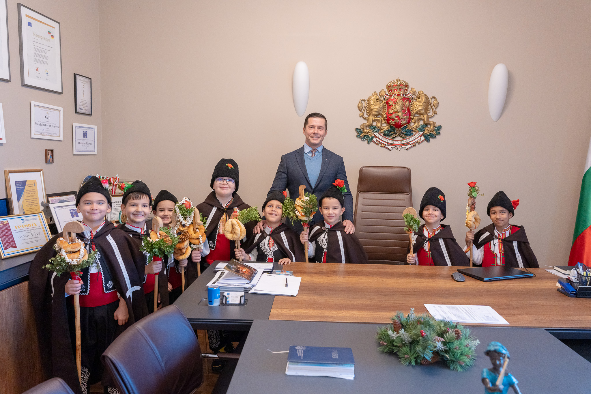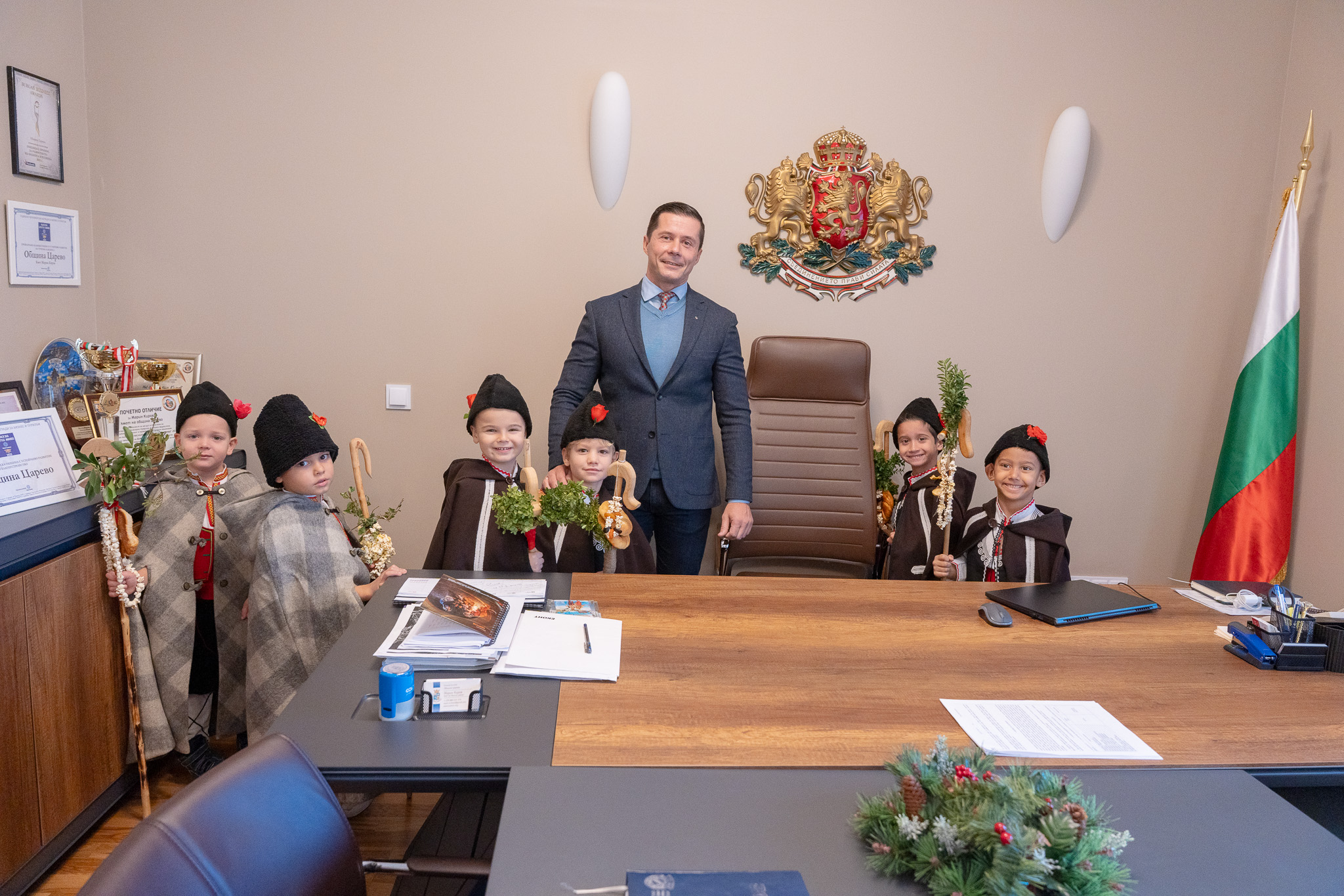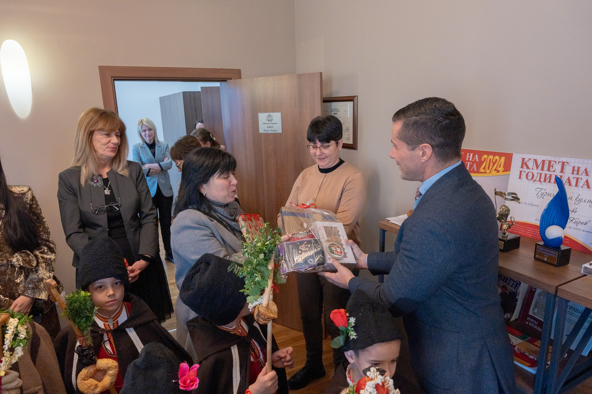 Коледарчетата бяха сърдечно посрещнати в присъствието на кмета на община Царево Марин Киров, заместник-кметовете г-н Денис Диханов, г-жа Мария Янакиева и инж. Стефка Колева, административния секретар на община Царево Мария Конярова, както и служители от общинската администрация. Кметът покани децата в кабинета си, където ги посрещна с почерпка и им подари празнични подаръци, като израз на внимание и признателност за създаденото коледно настроение.