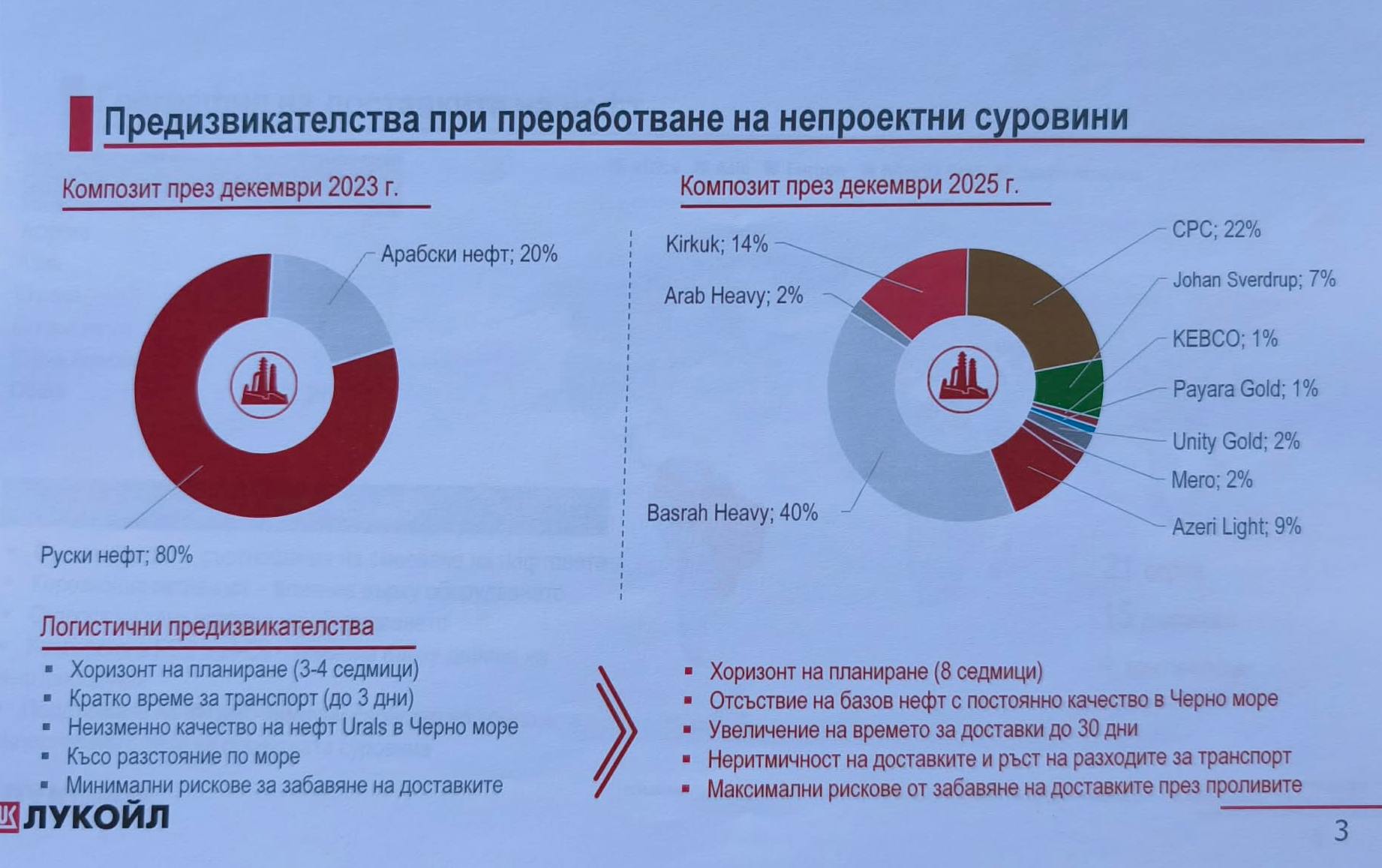 Според информацията, представена от особения управител Румен Спецов, доставките на суров нефт са напълно осигурени за първите месеци на 2026 г., постигната е значима диверсификация. За сравнение – до края на 2023 г. 80% от доставките са били с руски произход, сега суровината идва от 15 държави на 4 континента, като се обработват 21 различни вида нефт. Това е стратегическа крачка за гарантиране на независимостта от политически рискове и спекулативен ценови натиск.