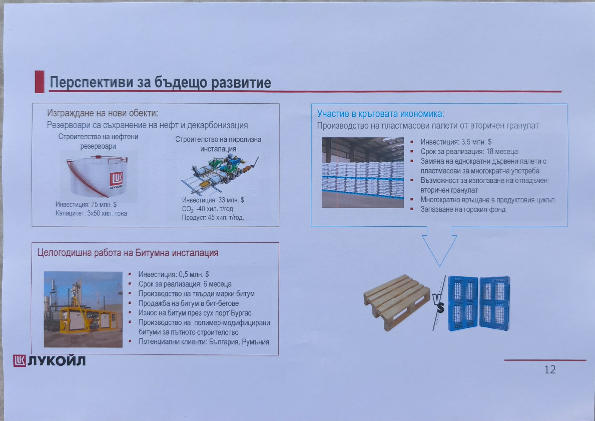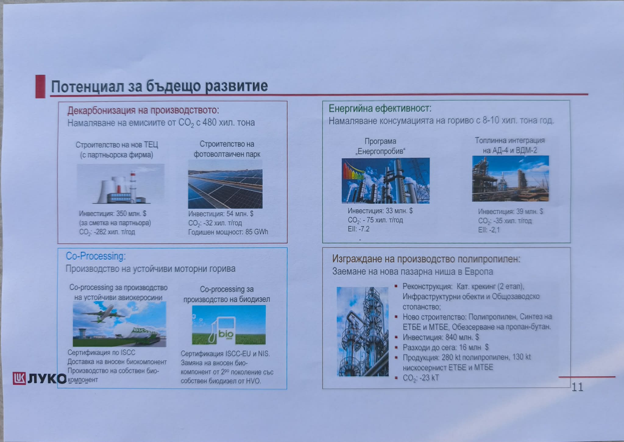 Пред Обществения съвет бе представена и концепцията за бъдещото развитие, включваща декарбонизация на производството – строителство на нов ТЕЦ с партньорска фирма (350 млн. долара), строителство на фотоволтаичен парк (54 млн. долара), изграждане на производство за полипропилен (инвестиция за 840 млн. долара) – заемане на нова пазарна ниша в Европа и други: