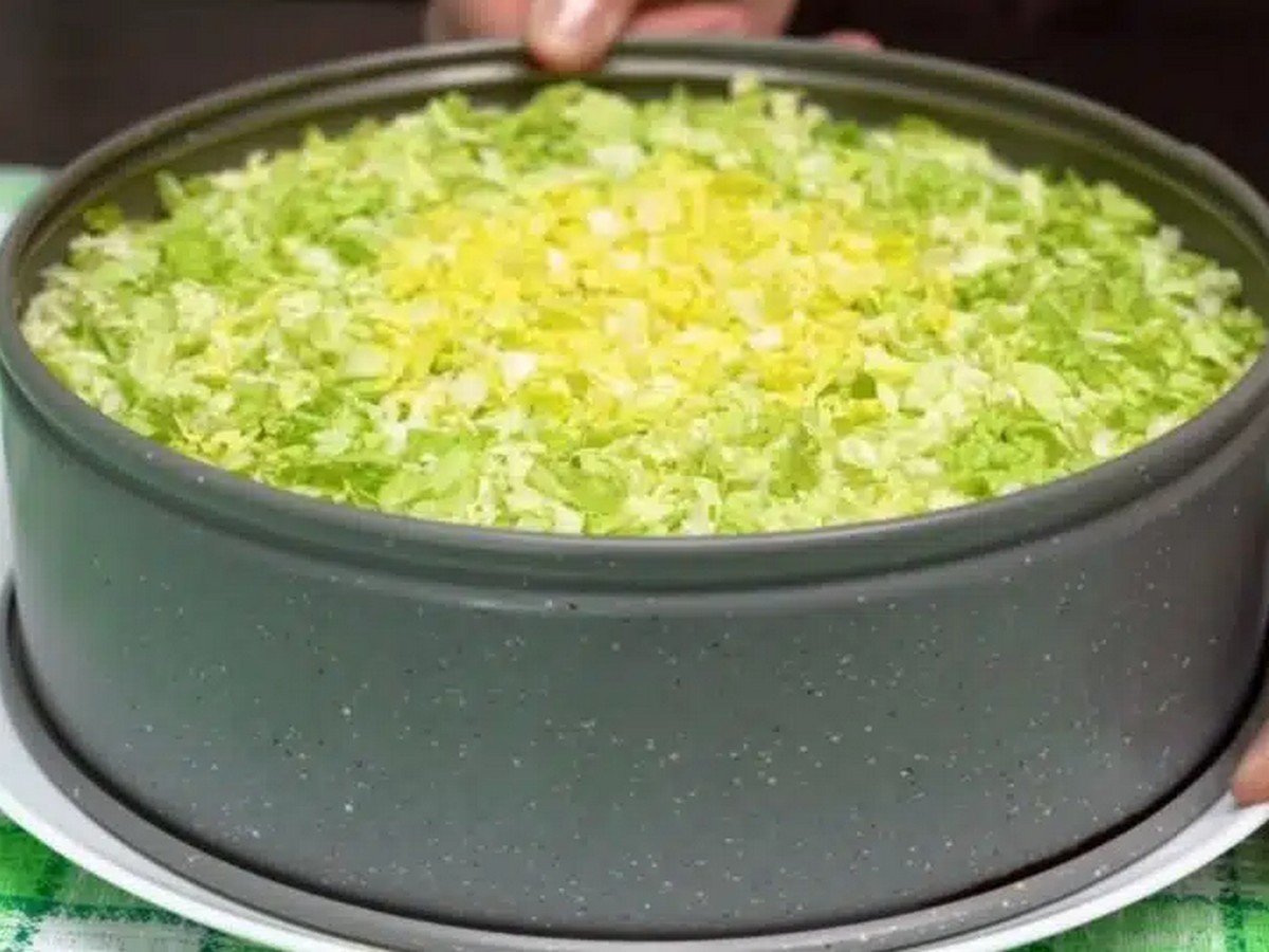 Китайското зеле или айсбергът се нарязват на тънко и се използват като финален слой. Салатата се охлажда, след което формата внимателно се отстранява и ястието се поднася директно на празничната трапеза.