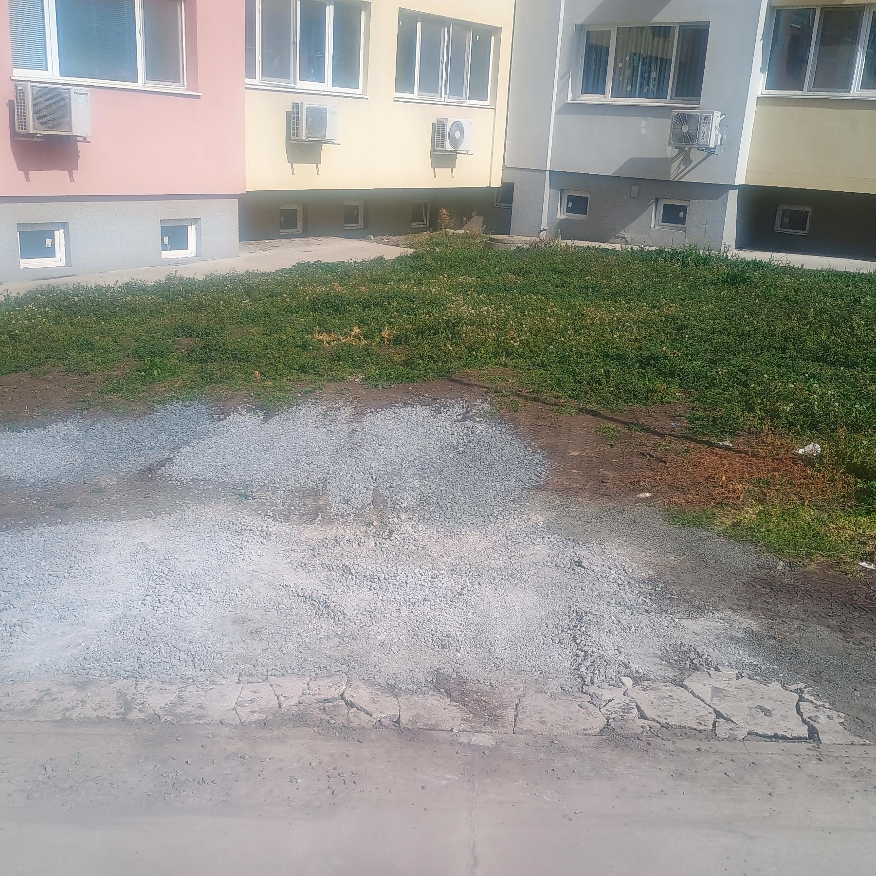 В сигнала се отбелязва още, че бетонната настилка между блока и гаражите е била разпробивана и според хора от района са се появили отвори. По време на снимките заснехме подобни дупки пред един от гаражите, вероятно оформени за поставяне на колчета.