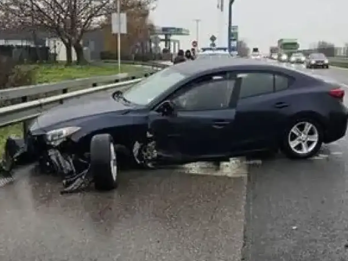Кола се е забила в крайпътната мантинела, показва разпространена във Facebook снимка. По машината има сериозни материални щети, като е препречила аварийната лента.