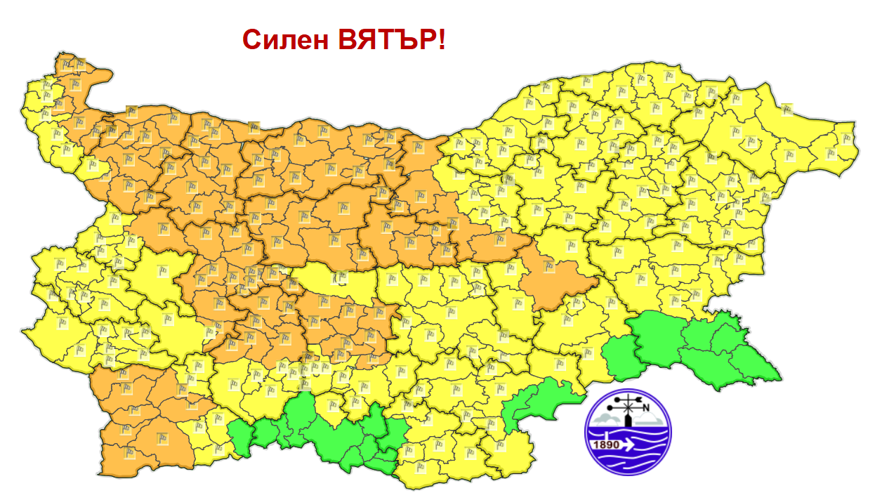 Най-засегнати ще бъдат 12 области с оранжев код, където поривите на вятъра могат да достигнат до 100 километра в час. Това включва: Видин, Монтана, Враца, Плевен, Ловеч, Велико Търново, Габрово, Сливен, София-област, Пазарджик, Пловдив и Благоевград.