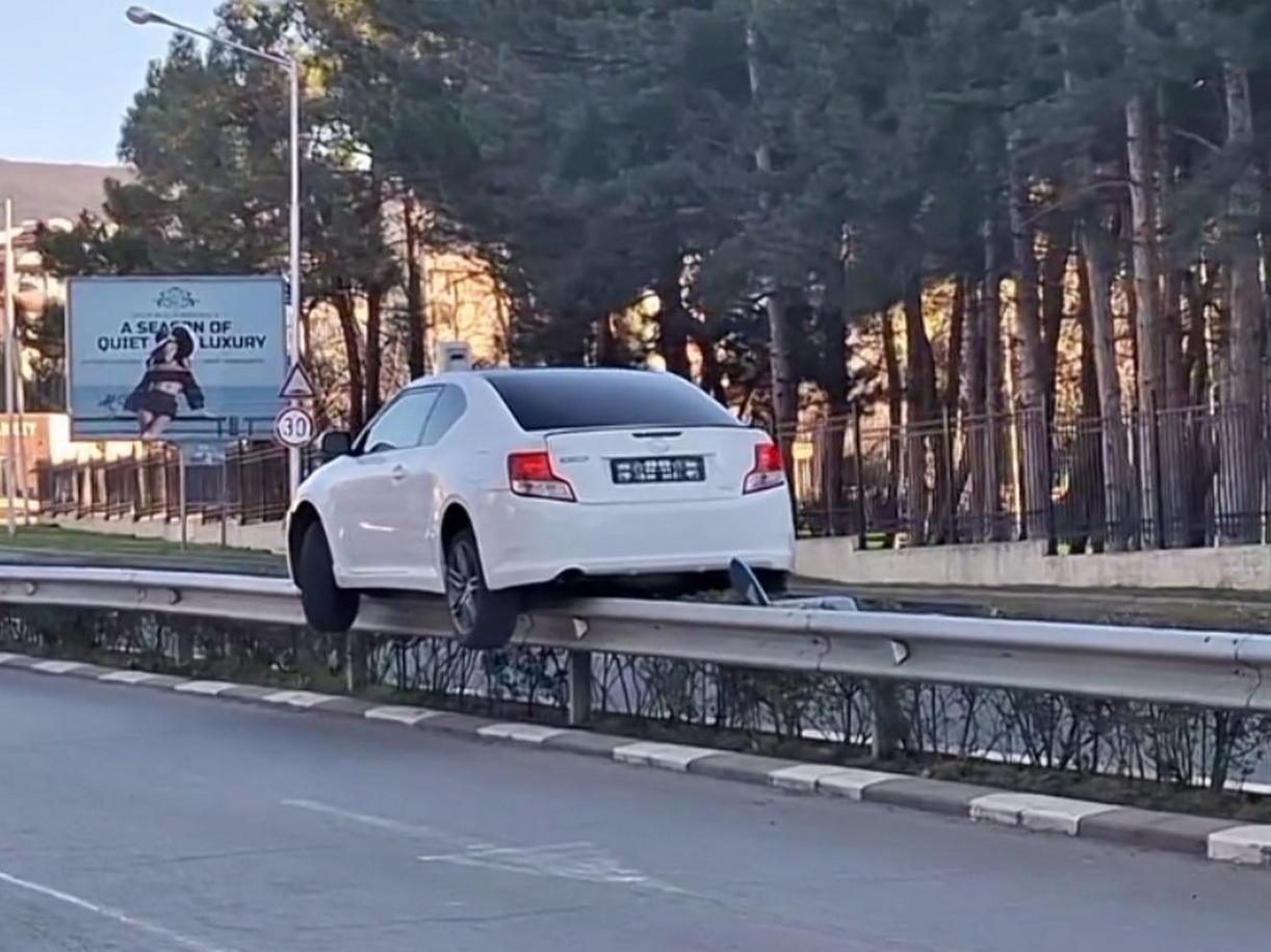 По непотвърдена информация, зад волана е била млада жена от украински произход, която, по неясни до момента причини, е успяла да се качи с колата върху скосената част на металното съоръжение.