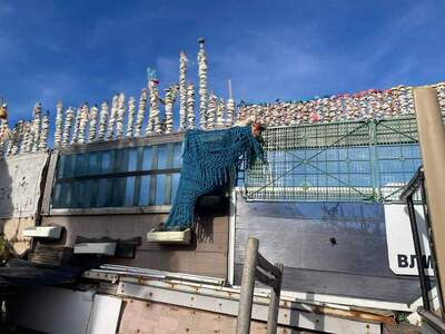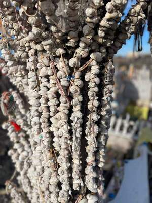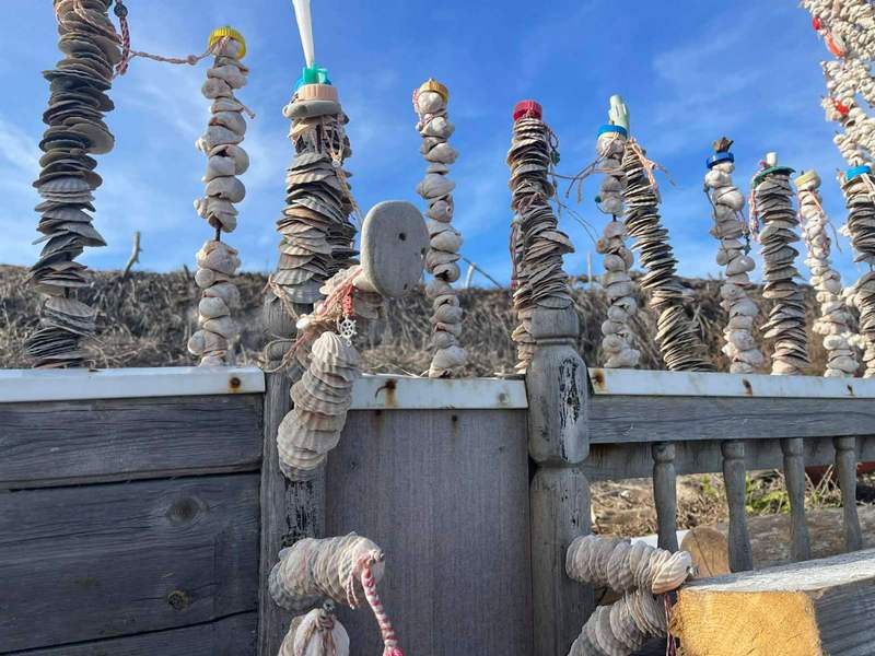 Но най-впечатляващи си остават детайлите, които са стотици, а принципът зад тях е един и същ - "мида върху мида, рапан върху рапан". Те скулптират огради, очертания и едно пустинно дърво, което гледа влюбено морето.