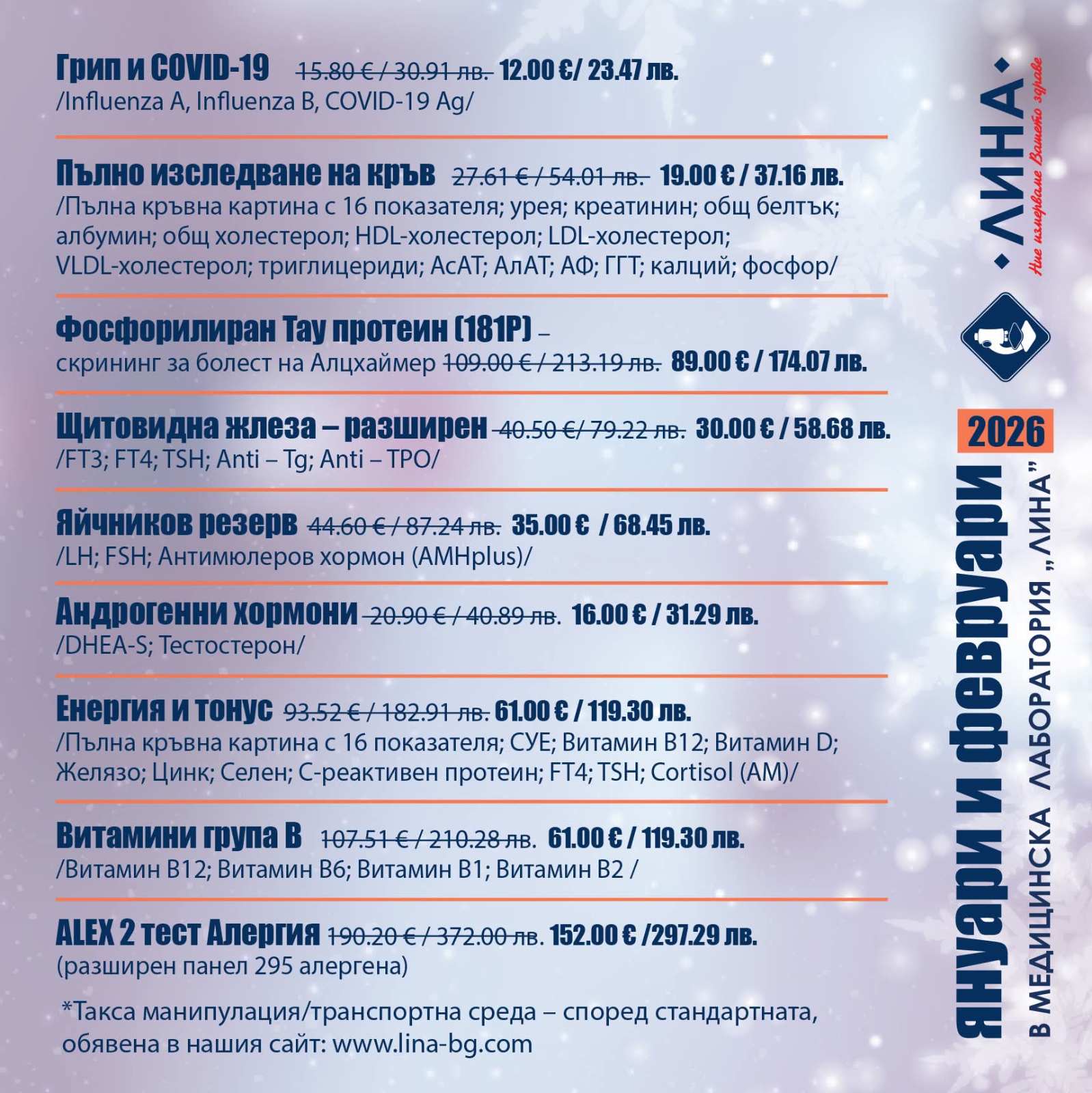 Началото на новата година е прекрасно време да се погрижим за здравето си. Затова през месеците януари и февруари 2026 г. „ЛИНА“ провежда 9 профилактични кампании с изследвания на специални цени. Те важат в самостоятелните обекти на лабораторията в страната. Предварително записване на час или направление от лекар не са необходими.