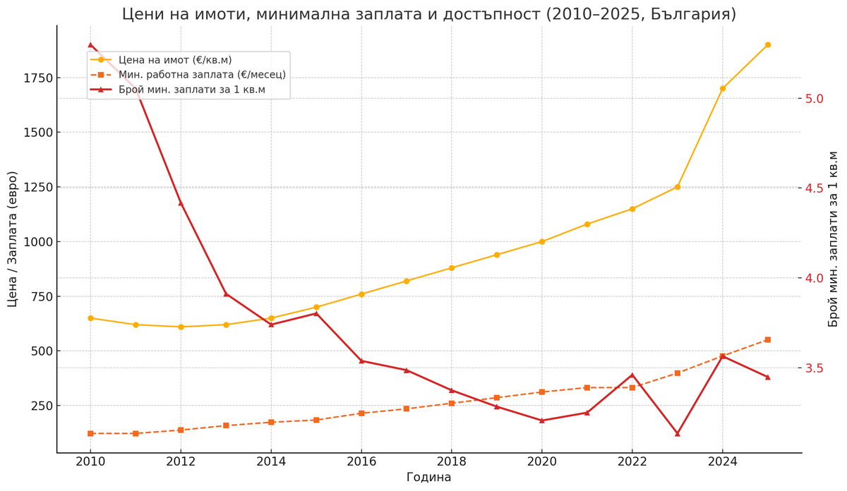 Според данните на НСИ и Eurostat, през 2010 г. средната цена на жилище е около 650 евро за квадратен метър, докато минималната работна заплата е приблизително 123 евро. Това означава, че тогава за закупуването на 1 кв.м жилище са били необходими около 5,3 минимални заплати.