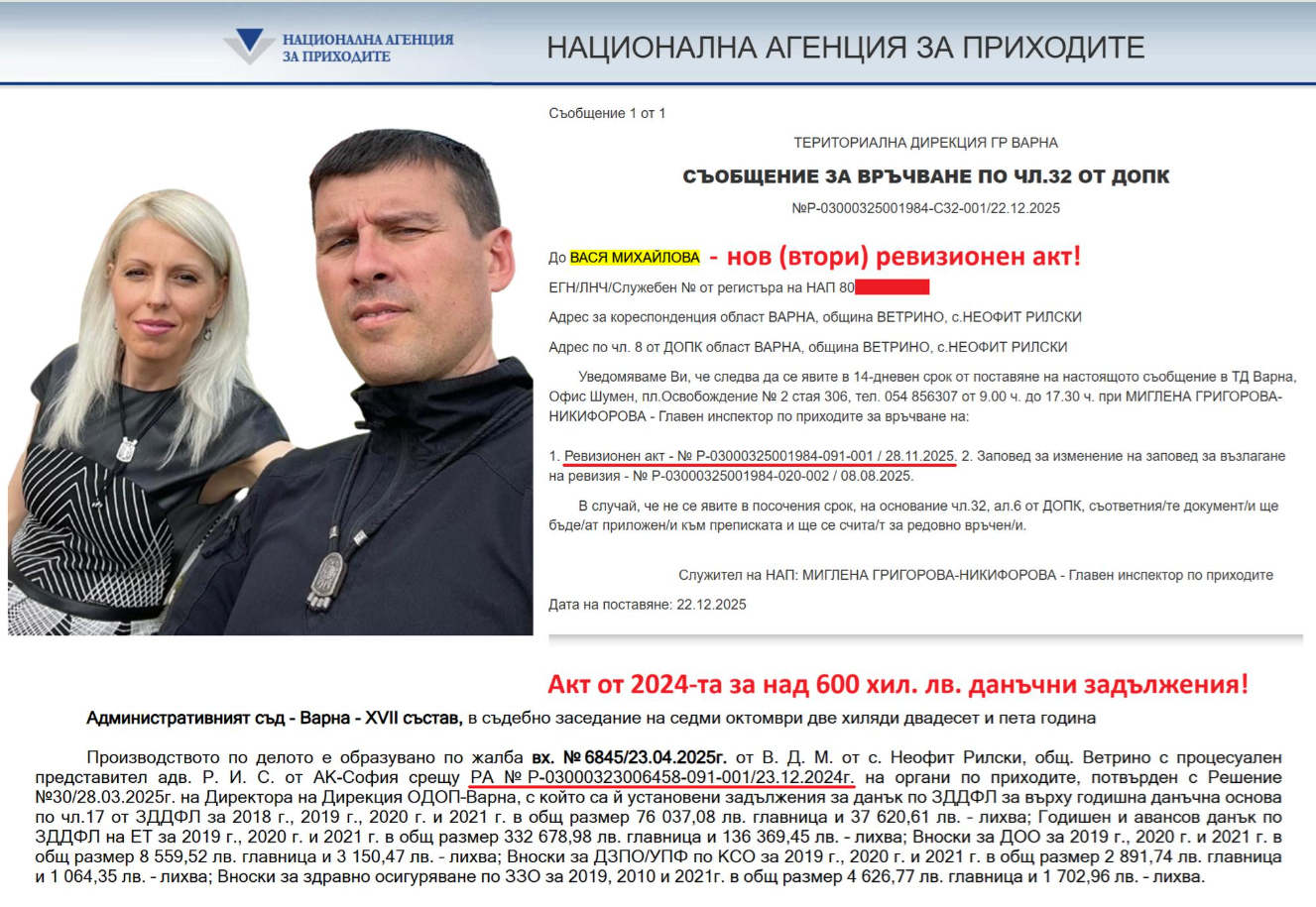 Това не е първият ревизионен акт, наложен на жената на Ивелин Михайлов, за която се твърди, че е във фиктивен развод с него. Предишният акт за 310 хиляди евро (над 600 хиляди лв.) от 23 декември 2024 г. е за данъчни задължения за периода 2018-2021 г. Вася Михайлова го обжалва по съдебен ред.