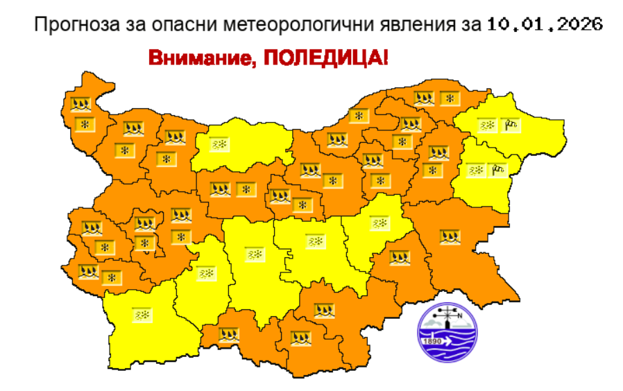 В тези райони се очакват интензивни валежи, които в събота ще започнат като дъжд, но с понижението на температурите бързо ще преминат в сняг. Тази динамика създава идеални условия за образуване на поледици и т.нар. "черен лед" по пътните настилки, което представлява сериозен риск за шофьорите.
