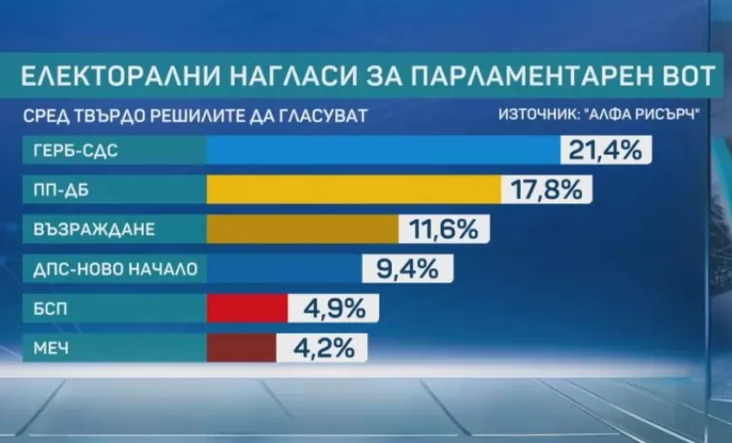 Лидер във вота, ако той се състои днес е ГЕРБ-СДС с почти 21.5 процента. ПП-ДБ са най-близкият преследвач на формацията с лидер Бойко Борисов. Възраждане, ДПС-Ново начало, БСП и МЕЧ също биха имали депутати, според нагласите в анкетата.