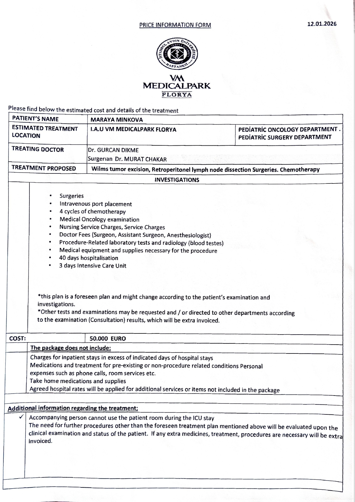 Малката Марая Минкова, едва на 3 години, дъщеря на наш съгражданин и педагог от СУ „Константин Петканов“ в Бургас, се бори с тежко онкологично заболяване - тумор на Уилмс (нефробластом) с метастази в лимфните възли. Диагноза, която преобръща живота на едно семейство за миг.