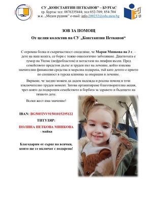 Колективът на СУ „Константин Петканов“ вече отправи своя зов за помощ. Днес го отправяме и към всички бургазлии с големи сърца. Нека заедно дадем надежда на едно малко момиченце, което заслужава да расте, да играе, да мечтае и да се смее.