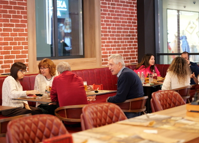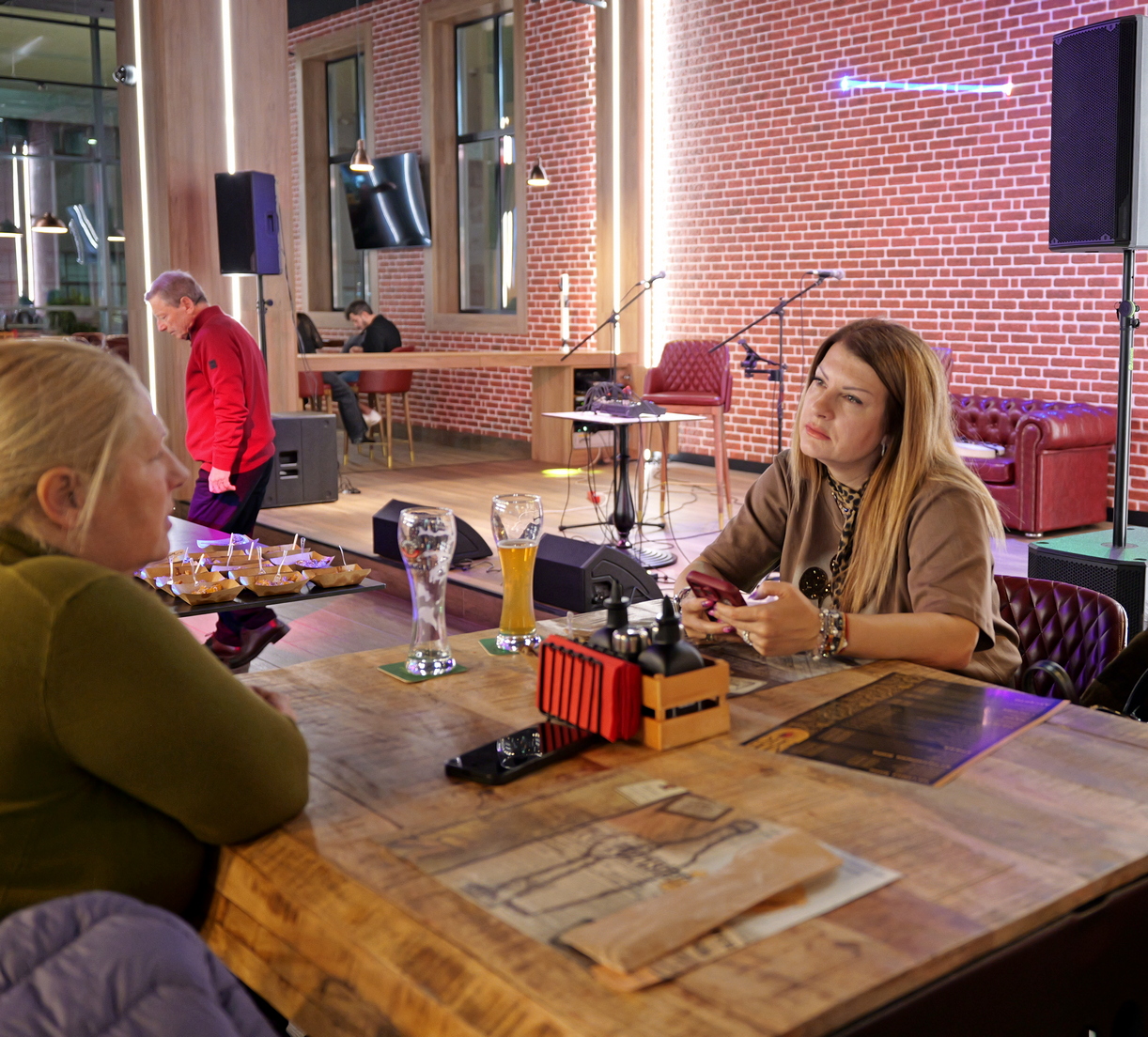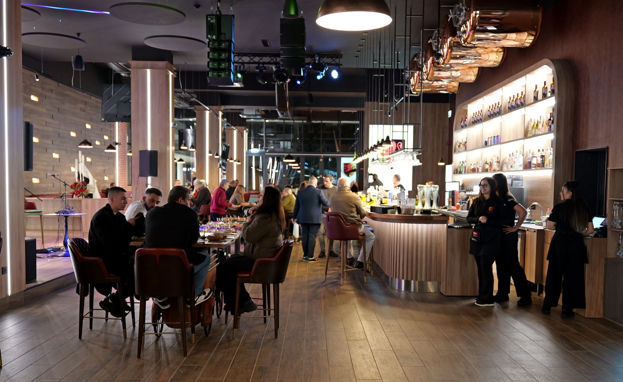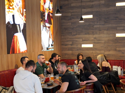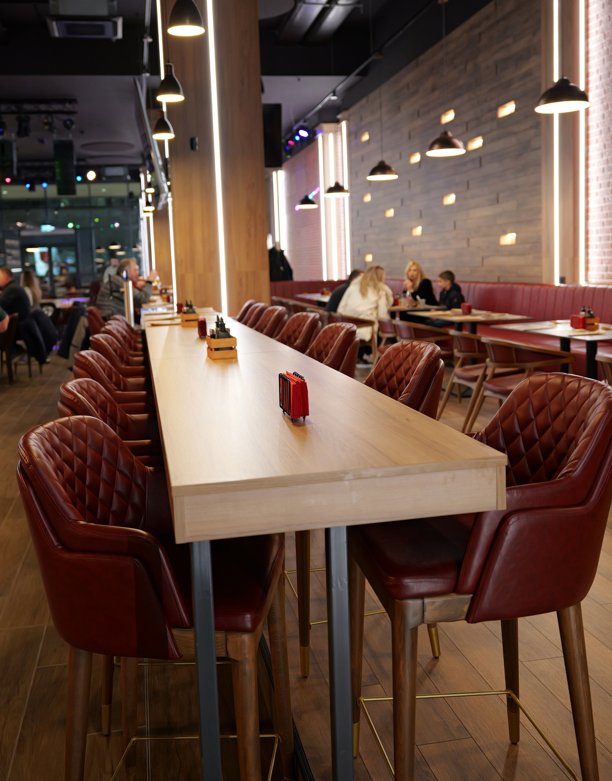 Интериорът веднага прави впечатление с ясно разпознаваем градски стил. Топли дървени повърхности, тухлени стени и кожени кресла в дълбоки червени тонове създават усещане за комфорт и стабилност. Осветлението е премерено - достатъчно малко за разговор, но и достатъчно ясно, за да следиш екрана или сцената. Масите са разположени така, че да има лично пространство, без да се губи чувството за общ ритъм в залата.