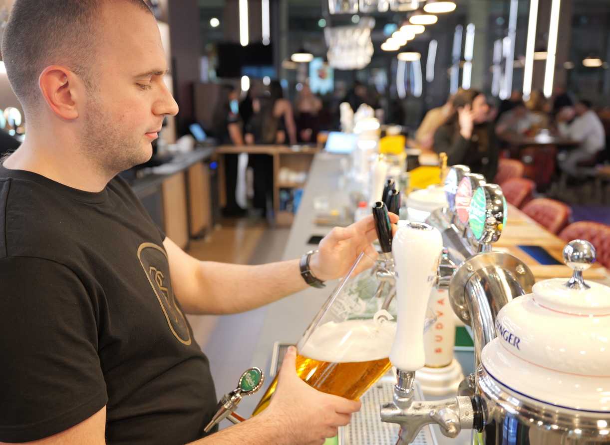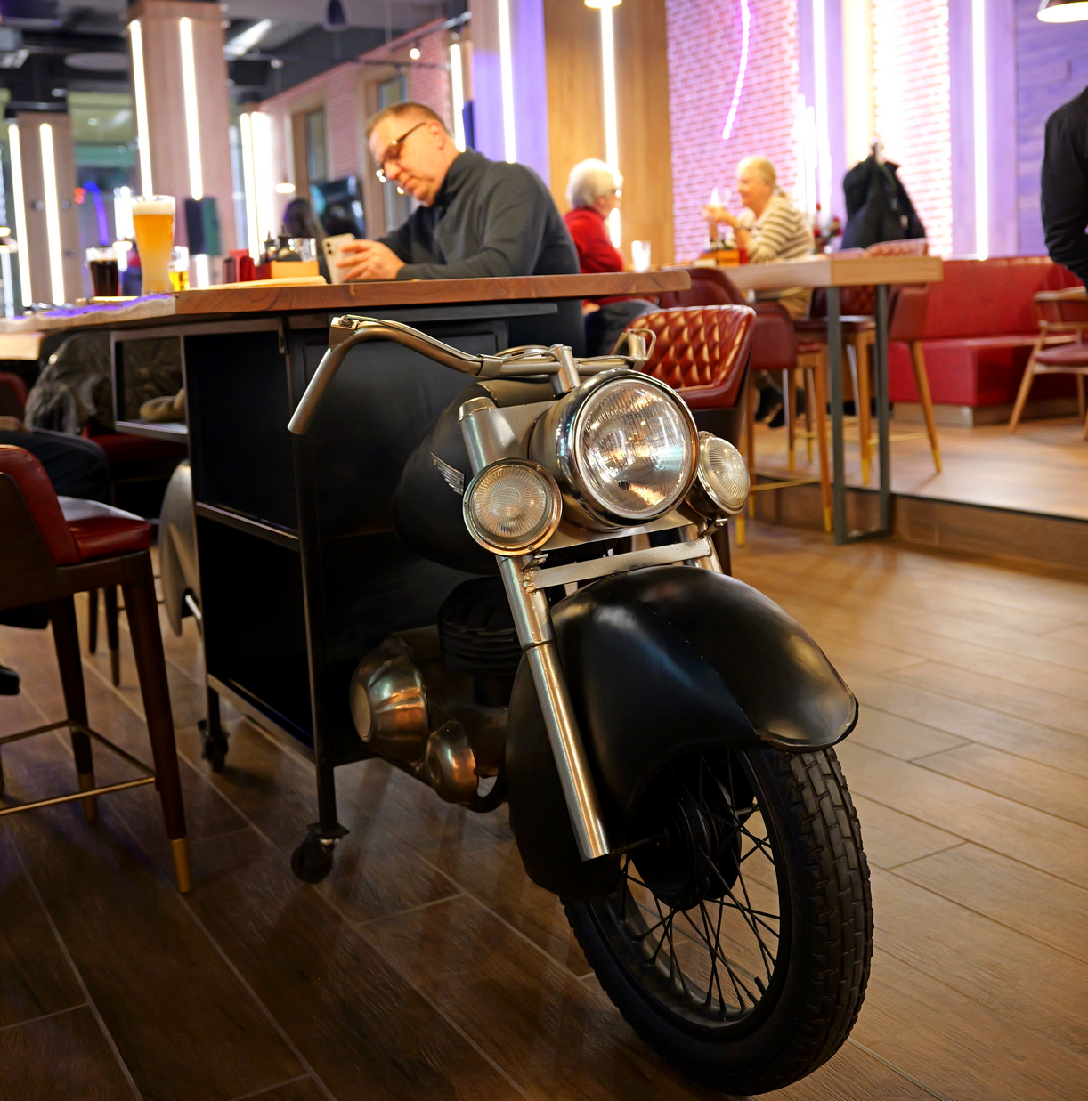 Детайлите носят характер. Част от обзавеждането е изградено около индустриални елементи, включително масиви с метални конструкции и акценти, които напомнят за класически барове с история. Барът е дълъг и отворен, с директен поглед към крановете за бира, а високите столове използват спонтанните разговори. Мястото позволява едновременно спокойна вечеря и жива, динамична атмосфера около бара.
