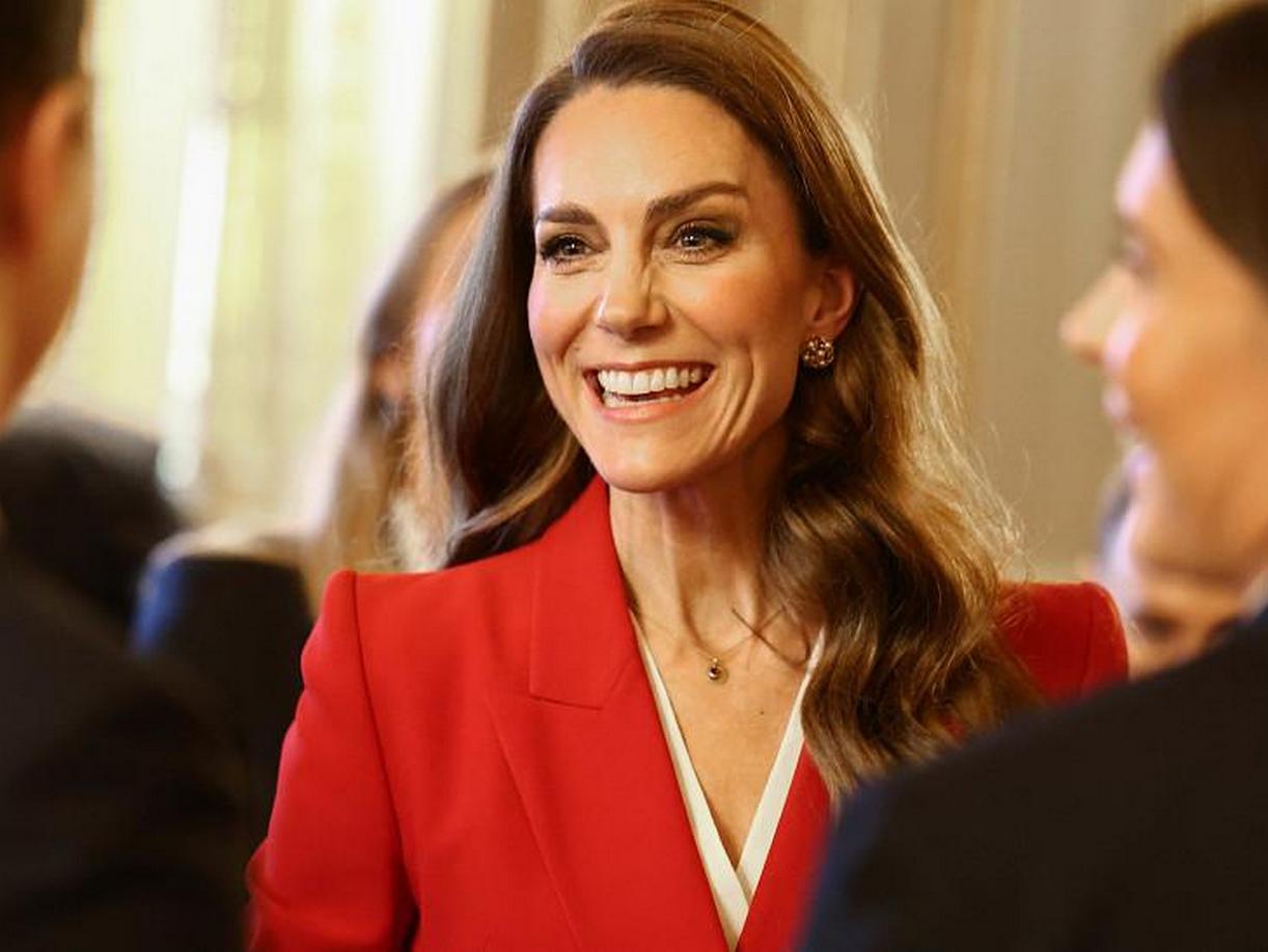 За събитието Катрин избра яркочервен костюм на любимия си бранд Alexander McQueen с широки панталони, асиметрично сако с копчета и бяла блуза с V-образно деколте, едва видима под сакото.