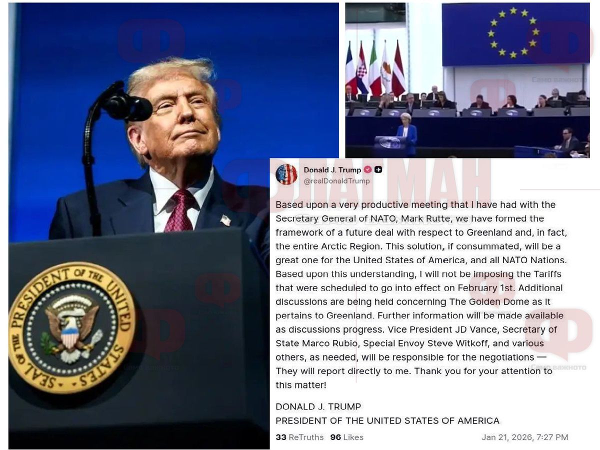 Напрежението между САЩ и Европейския съюз се изостря заради Гренландия – най-големият остров в света, който отново се оказва в центъра на световната геополитика. Президентът на САЩ Доналд Тръмп обяви в социалната си мрежа Truth Social, че оттегля заплахата си да наложи нови мита срещу европейски държави. Решението идва след срещата му с генералния секретар на НАТО Марк Рюте в Давос.