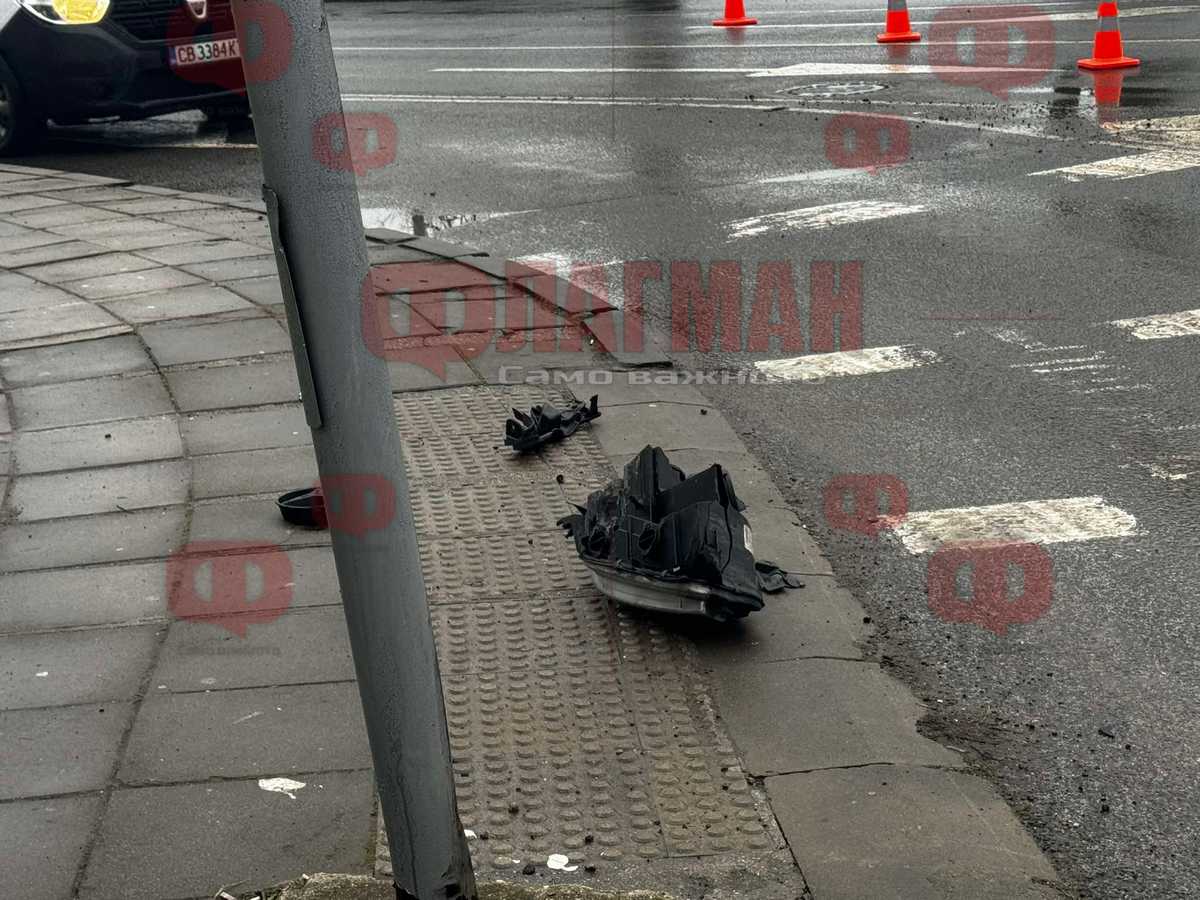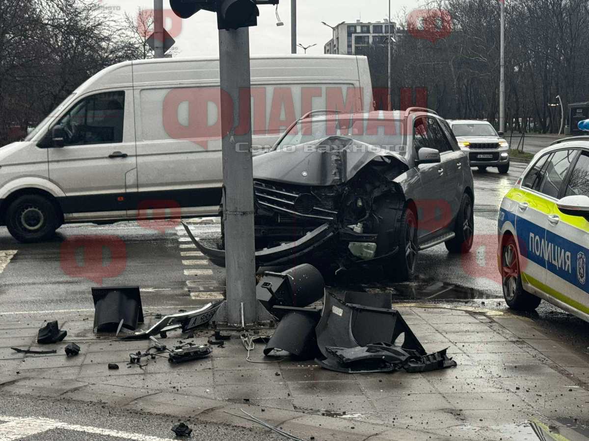 Джип Мерцедес с бургаска регистрация буквално се е забил в стълба на светофарната уредба. Предницата на голямата машина е смачкана. Около автомобила се виждат автомобилни части и отчупени елементи от светофара, тъй като ударът е бил доста силен.