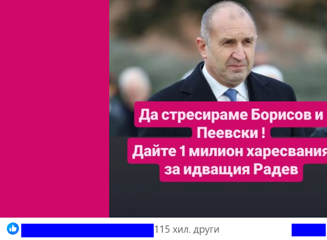 Във Фейсбук страницата "Национално Обединение" пусна снимка на Радев и написа: "Да стресираме Борисов и Пеевски! Дайте един милион харесвания за идващия Радев".