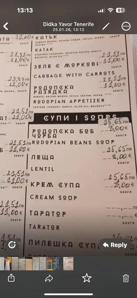 След разпространението на касовата бележка бяха публикувани и снимки на менюто от същия обект. Според тях супа се предлага за 8 евро, а обикновена салата от зеле и моркови достига цена от 11 евро. Това допълнително засили общественото недоволство и отвори дискусия за ценовата политика в българските зимни курорти, особено след въвеждането на еврото.
