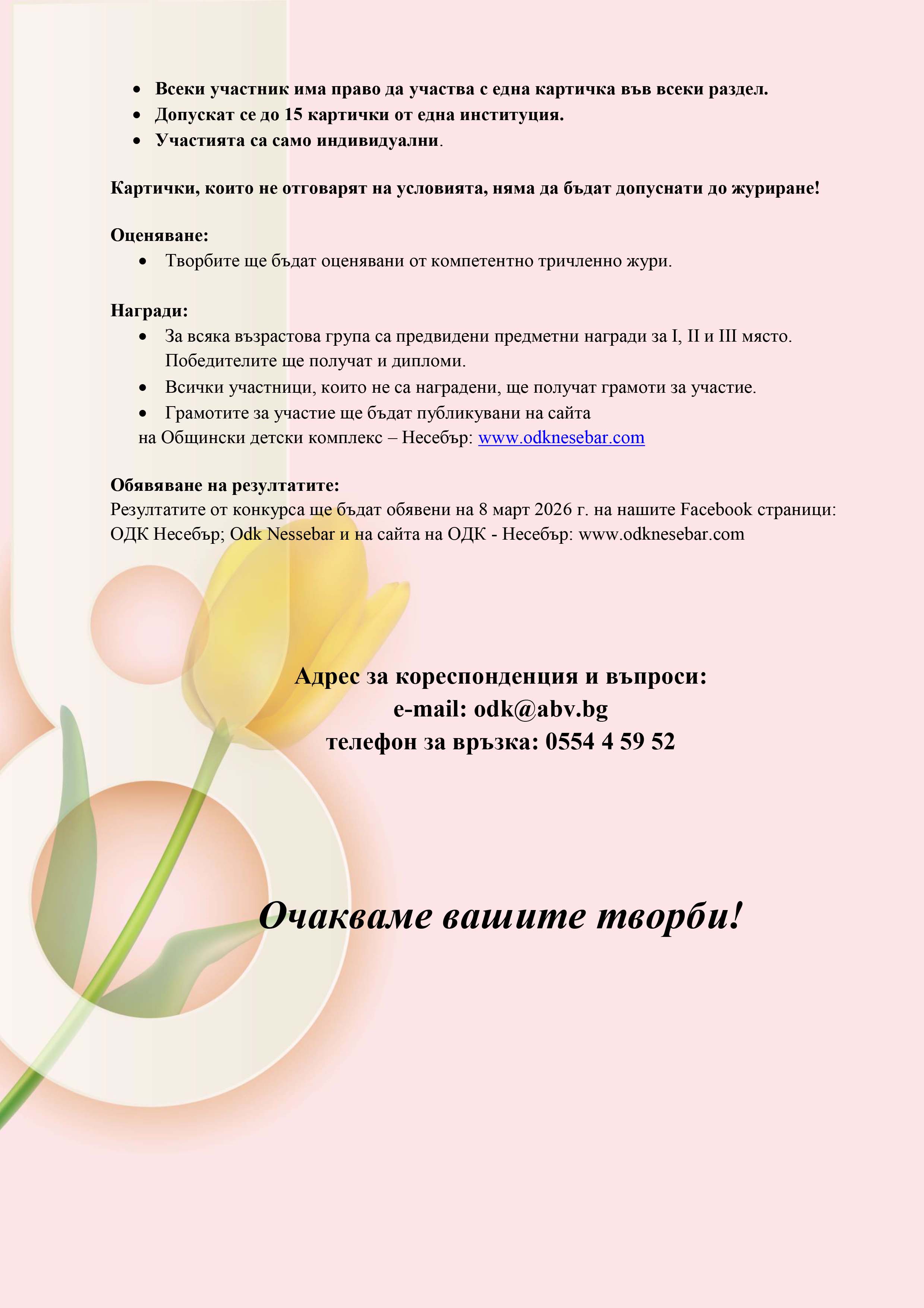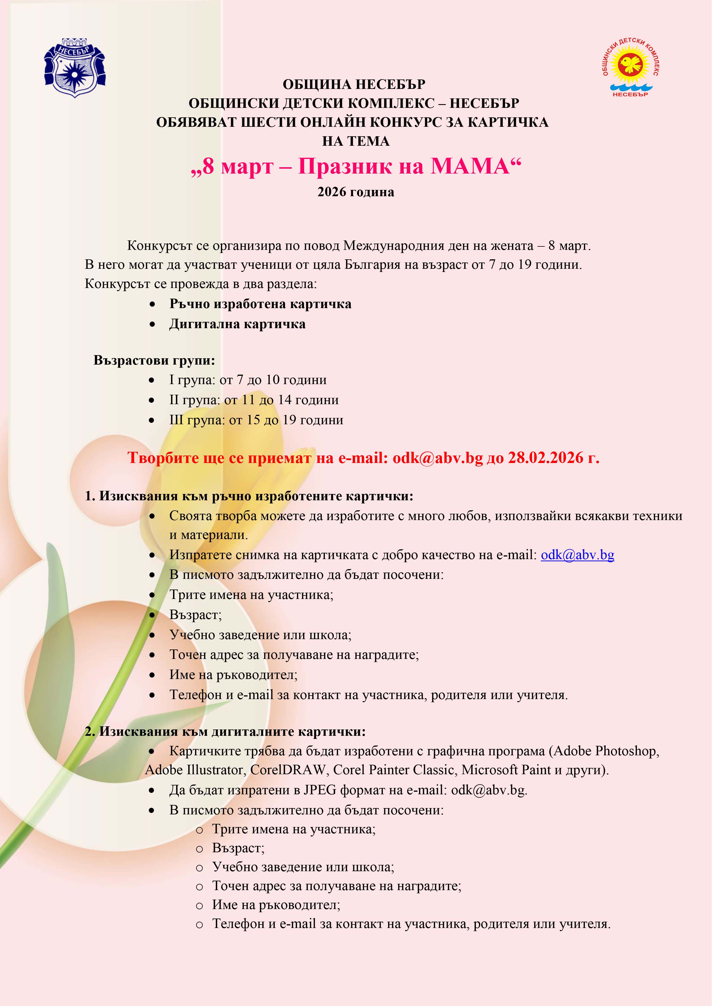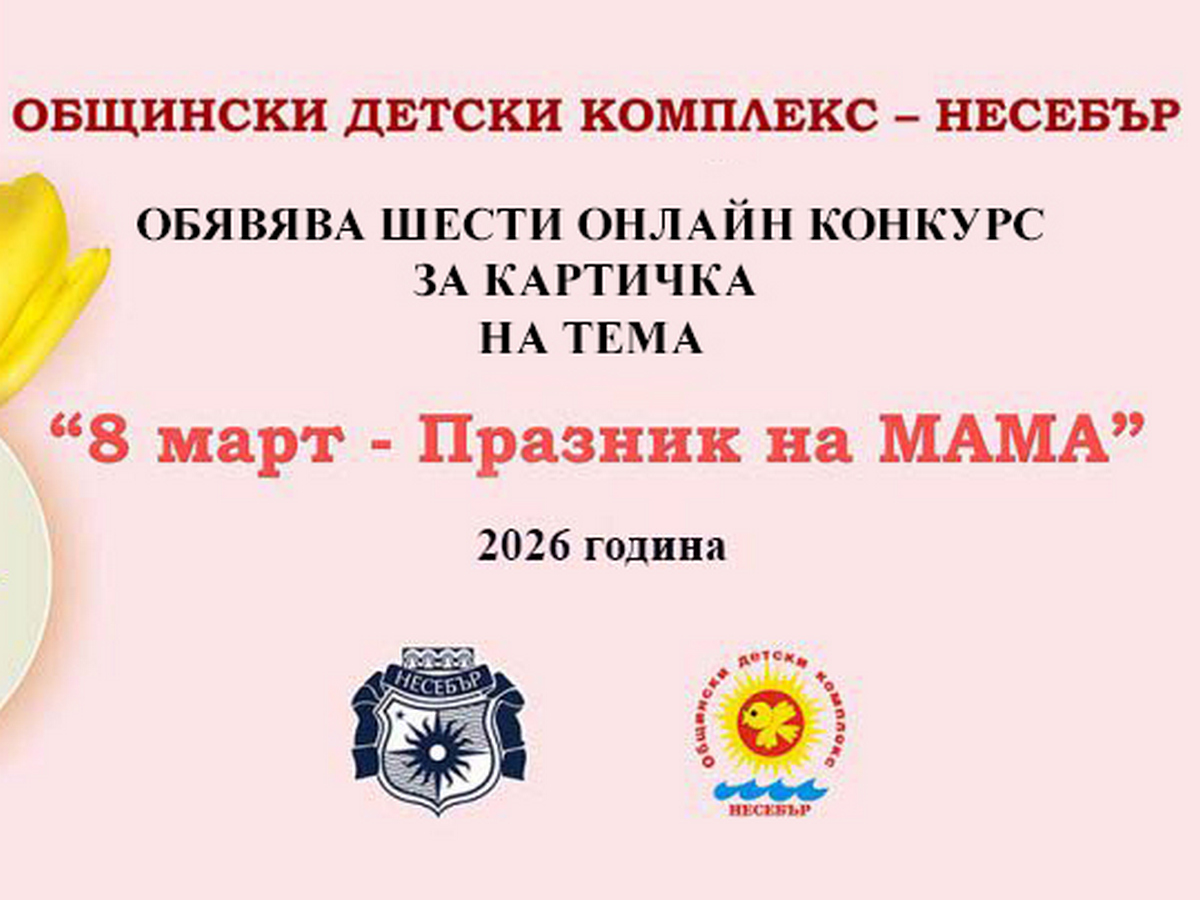 Община Несебър и Общински детски комплекс – Несебър обявяват шести онлайн конкурс за картичка на тема „8-ми март – Празник на мама“ – 2026 година. Конкурсът се организира по повод Международния ден на жената и в него могат да участват ученици от цяла България на възраст от 7 до 19 години. Провежда се в два раздела: ръчно изработена картичка и дигитална картичка.