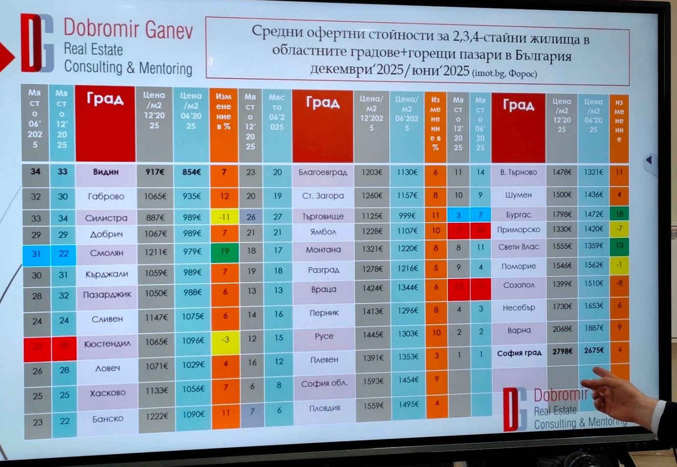 Данните, предоставени от модератора на дискусията в Добромир Ганев, показаха динамика в много от черноморските градове - Бургас, Несебър, Поморие, Приморско, Свети Влас и Созопол. Тези пазари са особено важни, тъй като комбинират, както търсене от български купувачи, така и от чуждестранни, особено за ваканционни имоти.