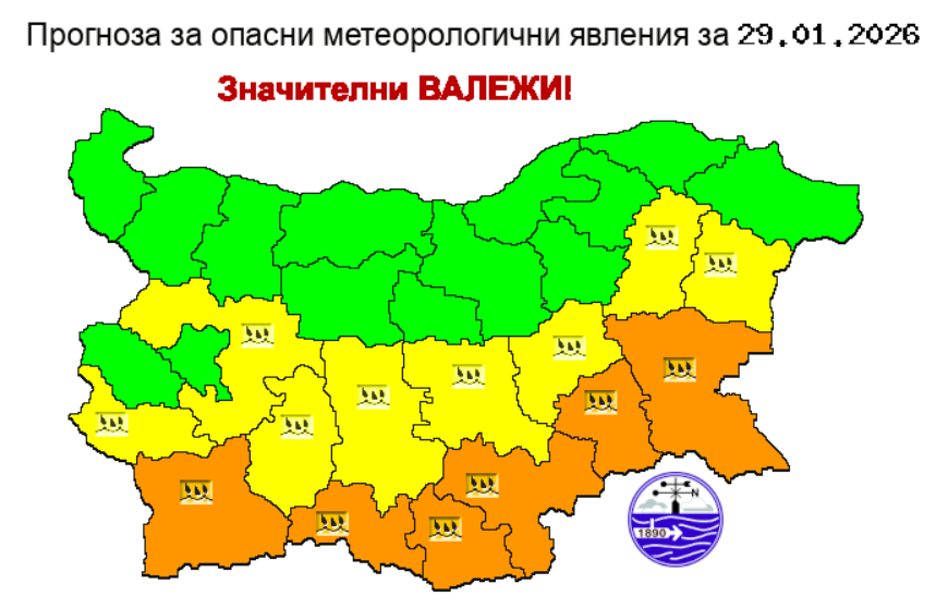 Предупреждение за значителни валежи за днес - 29 януари, от втора степен - оранжев код, издаде НИМХ за областите Благоевград, Смолян, Кърджали, Хасково, Сливен и Бургас.