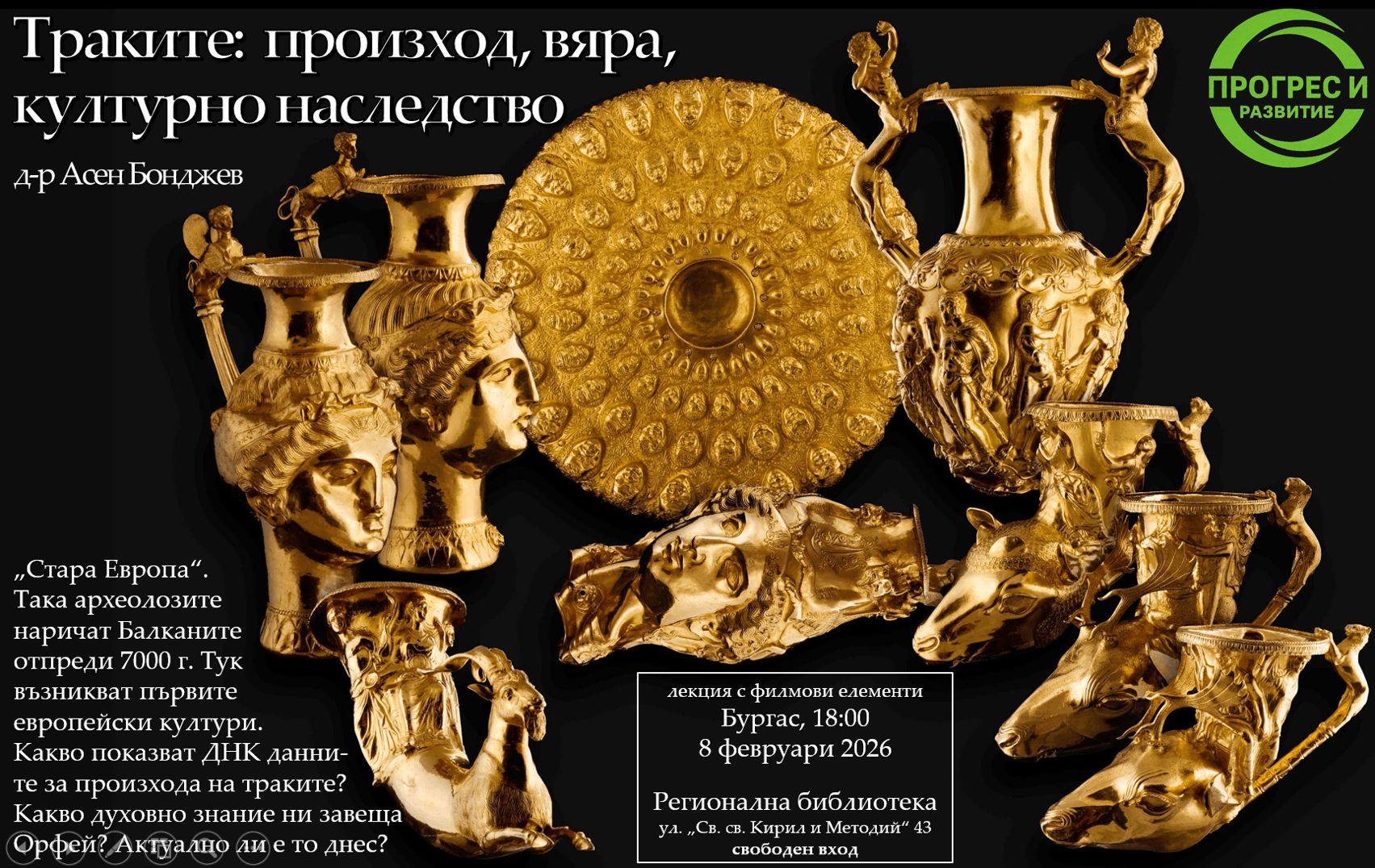 елементи "Траките - произход, вяра и културно наследство", ще бъде проведена на 08.02.2026 от 18.00 часа в регионална библиотека „Пейо К. Яворов“ гр. Бургас!