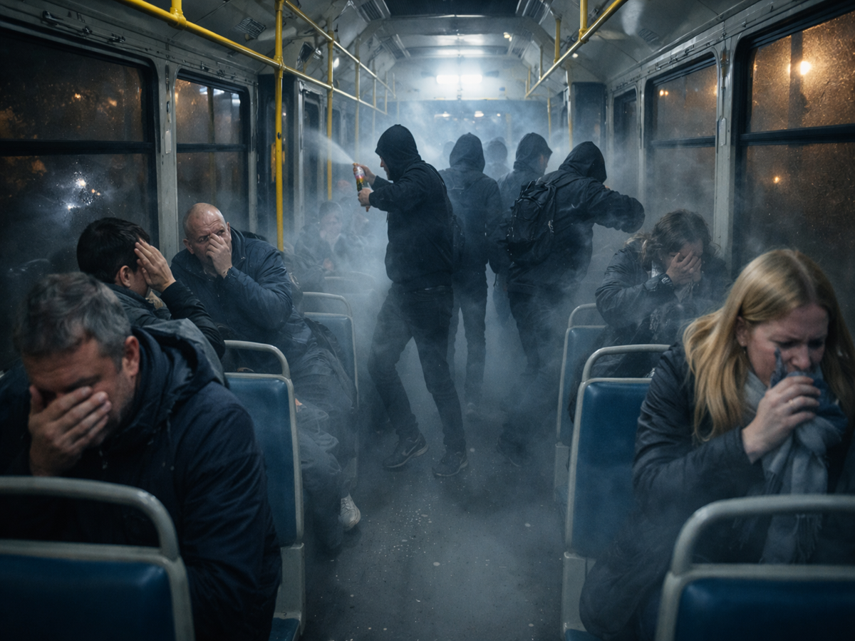 Сцена, наподобяваща кадър от екшън филм, се разигра в столицата . Петима младежи, облечени в тъмни дрехи, предизвикаха паника и напрежение в тролей №5, след като в движение атакуваха пътниците с лютив спрей.