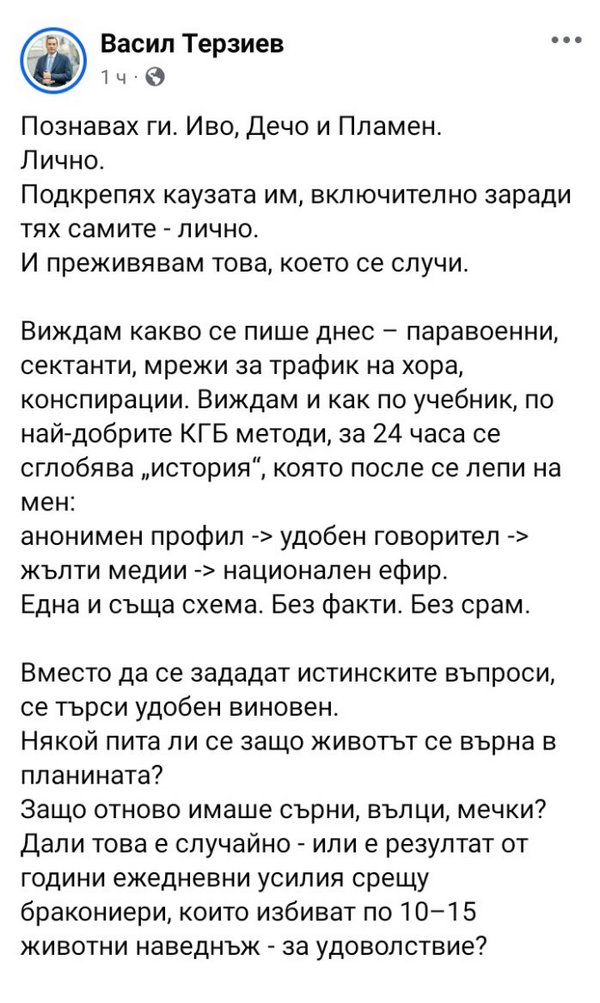„Помагал съм им открито, наред с много други хора“, пише той. И подчертава: „Не бих дарявал, ако имам и най-малкото притеснение. И не съжалявам нито за миг.“„Това бяха хора, които не просто пазеха природата, а я познаваха в дълбочина. Едни от най-добрите пещерняци в България. И едни от най-добрите пещерни водолази в света“, написа още Терзиев, като нарече обвиненията срещу тях „клевета“ и настоя за проверими факти от разследващите органи.