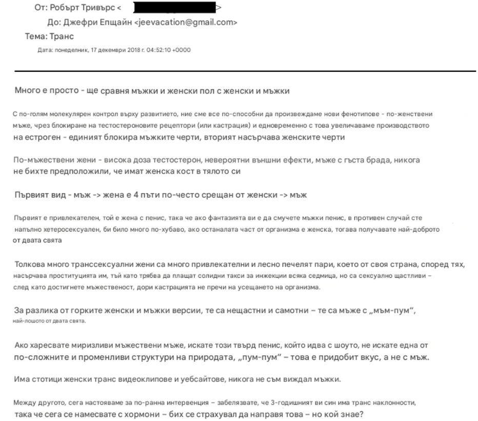 Там пише: „Ние вече настояваме за по-ранна интервенция. Ако забелязвате транссексуални наклонности у вашия 3-годишен син, можем да се намесим с хормони. Бих се страхувал да направя това. Но кой знае?“ Биологът обсъжда и други либерал- глобалистки аспекти. Той например твърди, че ако мъж прави фелацио на момченце с напълно женствено тяло, това няма да го превърне непременно в хомосексуалист. „Това би било много по-хубаво, ако останалата част от организма е женска, защото получавате най-доброто от двата свята“. Няма документиран отговор от Епщайн на този конкретен имейл.